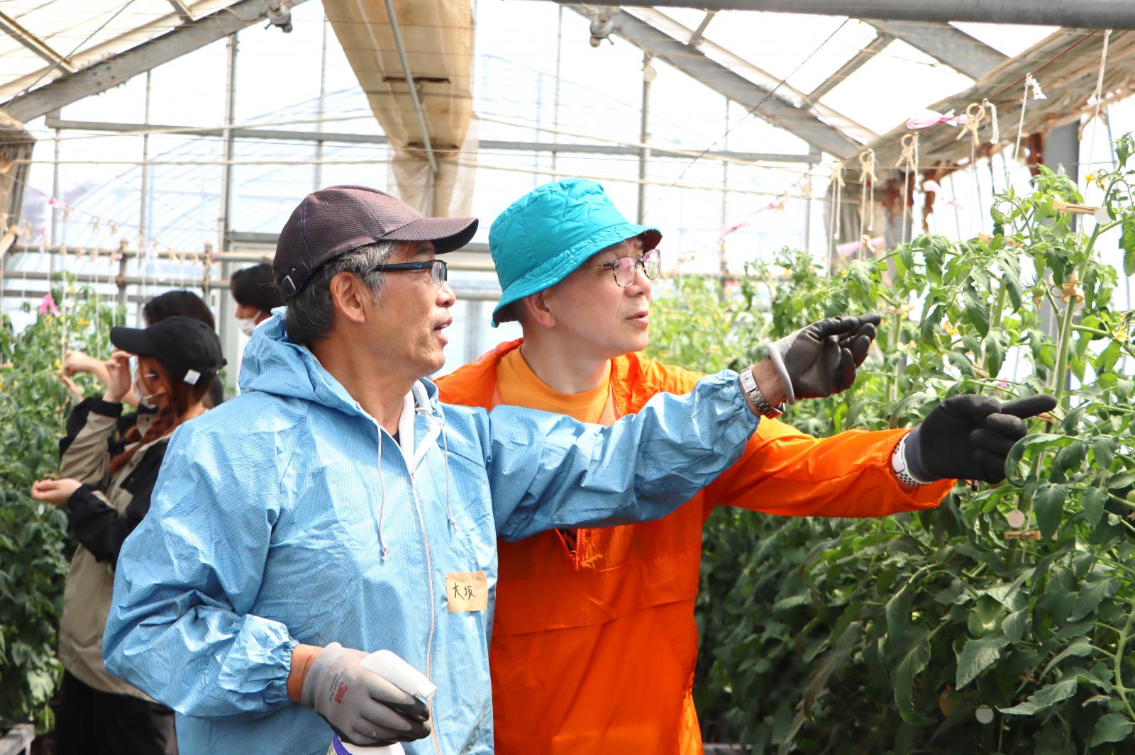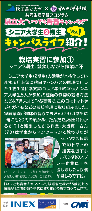 家庭菜園が趣味の菅原文夫さん(73歳)は、学生に「俺にも20代の頃があったんだで。今が青春!!ところで秋田弁わがるが?」。加藤より子さん(70歳)は、「まあ~楽しい。土いじりは大好きだけど学生さんとおしゃべりできるのが幸せ」。柴田文さん(65歳)は「私の子どもは秋田県立大学卒業生。こんなに楽しい学生生活を送ったんだね~」など、学生と楽しく雑談しながらを進めました。大坂真一さん(70歳)は、学生からマンツーマンで教わりながら、ハウス栽培でのトマトの結実を促すホルモン剤のスプレー作業に汗を流しました。7月、収穫が楽しみですね~。
