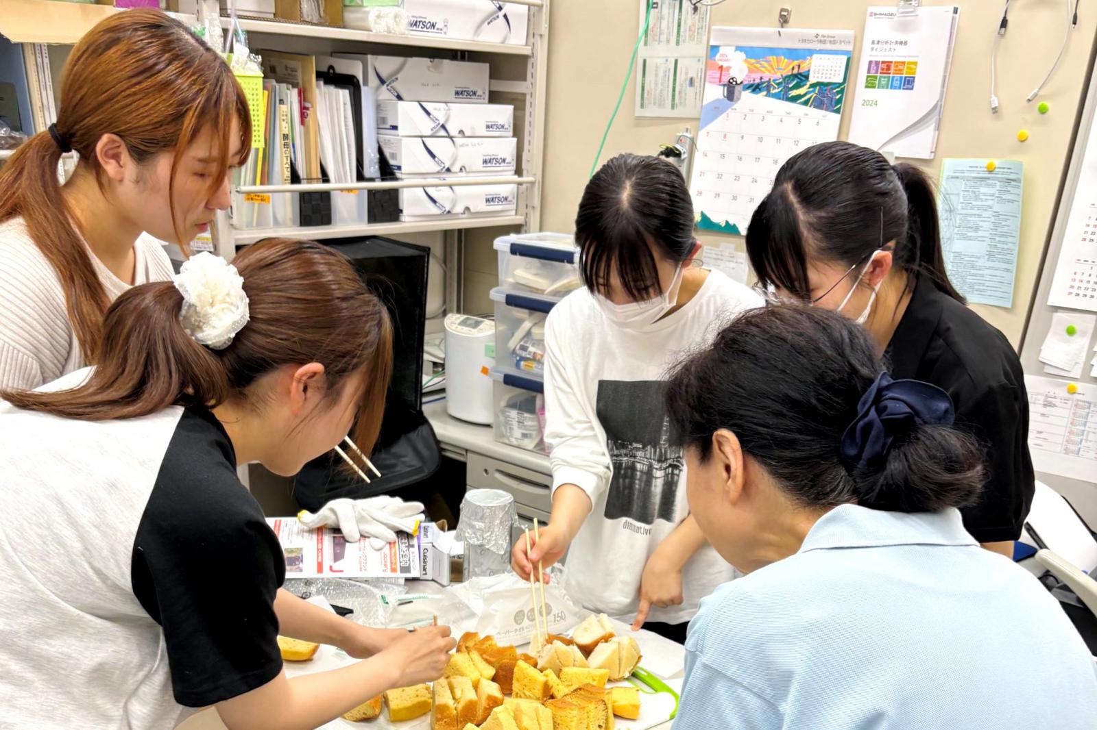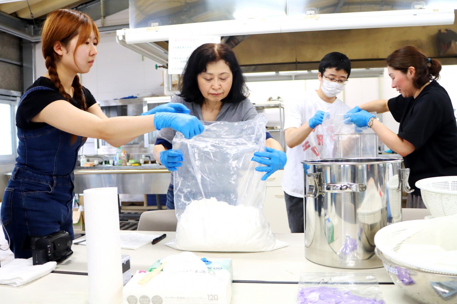 シニア大学生の佐々木裕子さん(69歳)は応用生物科学科1年生の学生自主研究グループ「Rice&Bread ライスアンドブレッド」の学生と一緒に、製パン適性の高い野生酵母を用いた米粉パン作りに向け準備を進めています。