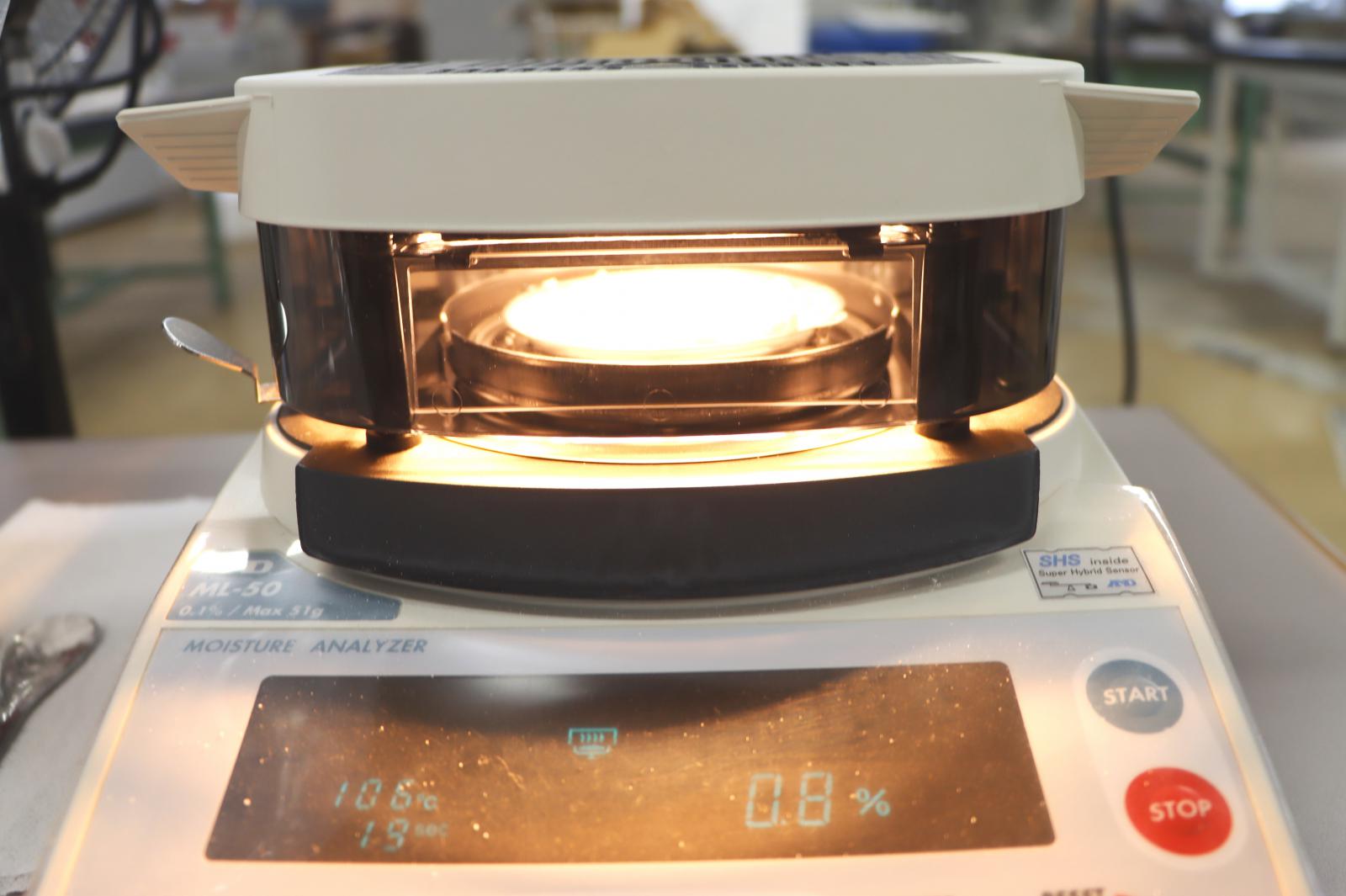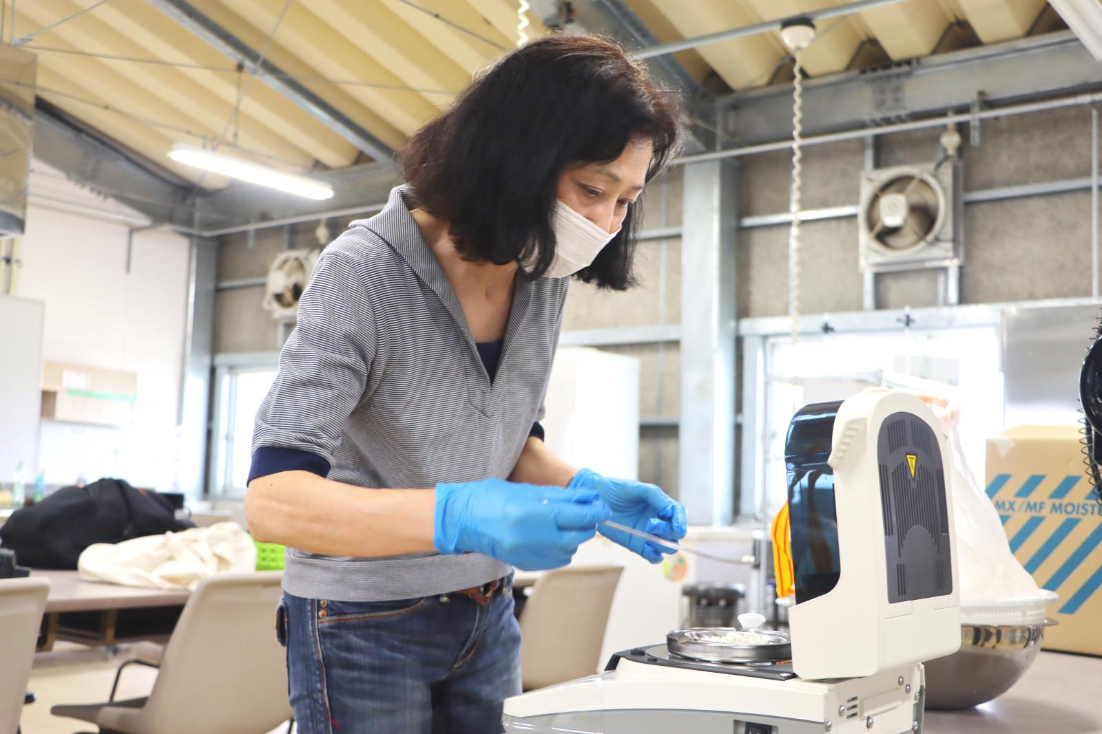 イネを使ったデンプン生合成に関する研究やダイエット米への実用化等に取り組む、生物生産科学科の藤田直子教授[専門:植物生理学]らが開発したイネ品種「あきたさらり」6キロを研ぎ、水分含有量を管理しながら製粉機でふんわりした米粉をつくりました。