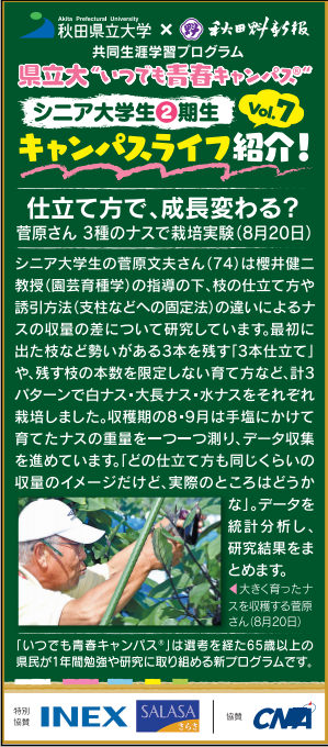 シニア大学生の菅原文夫さん(74歳)は、自宅で約200坪の畑で様々な野菜作りを実践していますが、害虫被害や病気の発生に悪戦苦闘しており、害虫や病気に侵されない育て方や環境の整え方、効果的な対処法を学ぶため、いつでも青春キャンパスに応募しました。