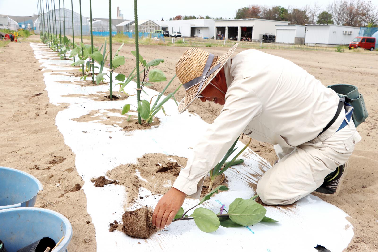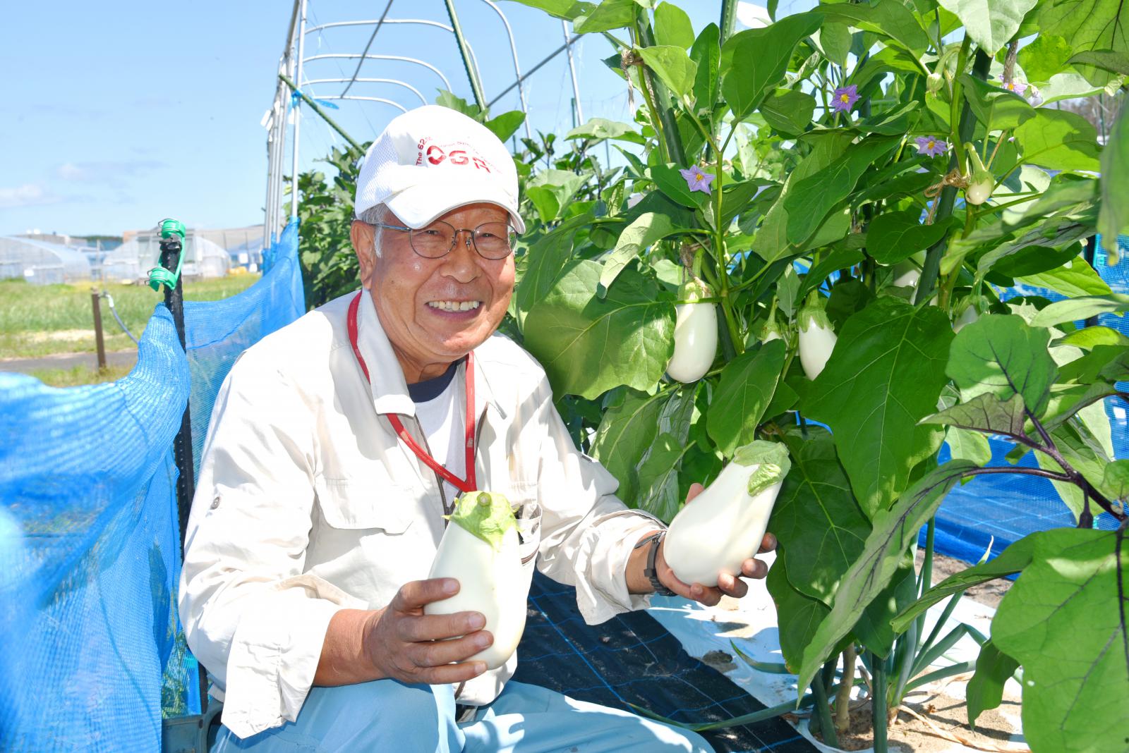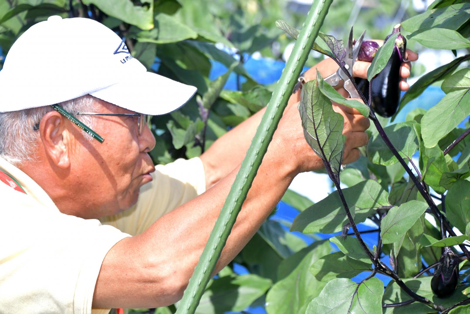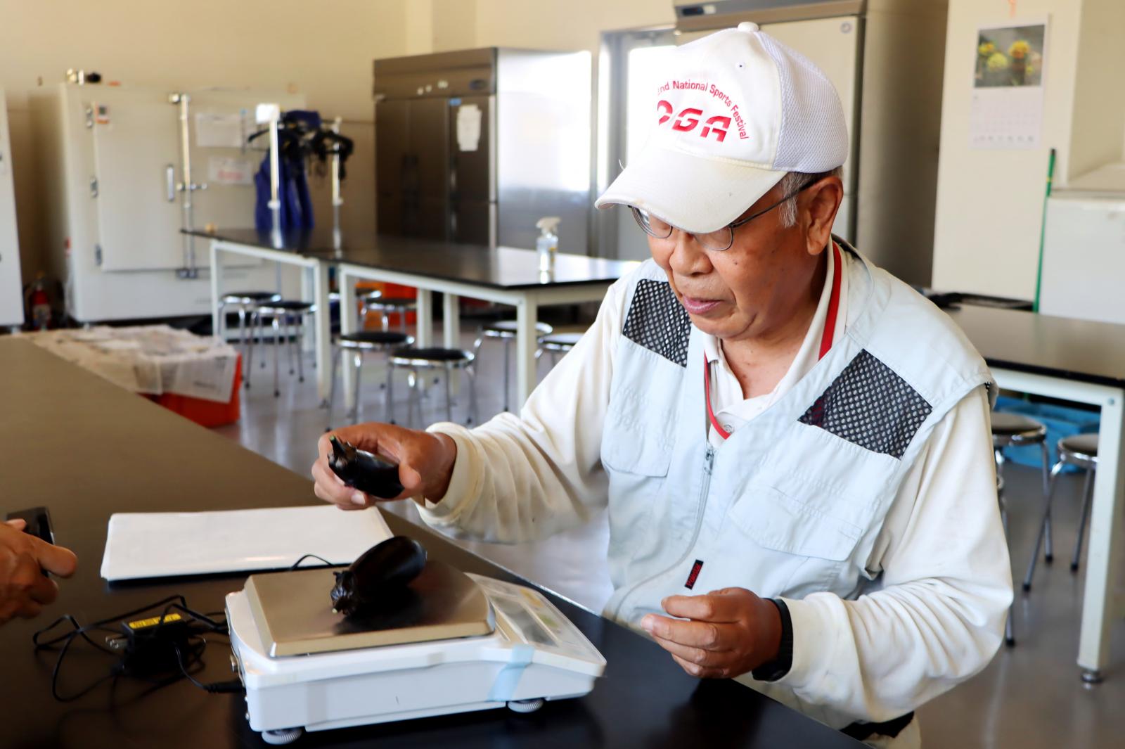 最初に出た枝など勢いがある3本を残す「3本仕立て」や、残す枝の本数を限定しない育て方など、計3パターンで白ナス・大長ナス・水ナスをそれぞれ栽培しています。収穫期の8・9月は手塩にかけて育てたナスの重量を一つ一つ測り、データ収集を進めています。