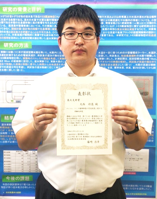 生物資源科学部アグリビジネス学科卒業生の大西将嵩さん(現 秋田県農林水産部農山村振興課)が、9月10日〜13日に弘前大学文京町キャンパスで開催された「2024年度(第73回)農業農村工学会大会講演会(全国大会)」において、『トミヨ属雄物型の突進速度に関する実験的研究』について発表し、見事、ポスター賞を受賞しました。