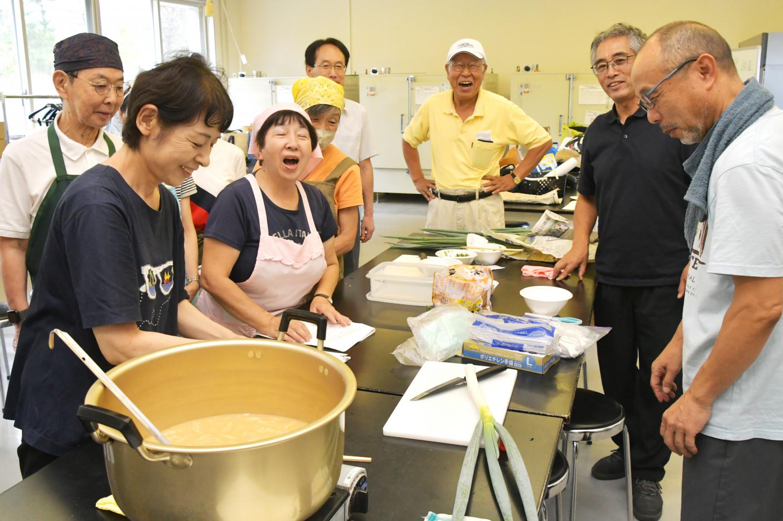 本格的な納豆汁を作った経験のない2期生は、1期生の小西さん(株式会社ヤマダフーズ)に作り方のアドバイスを受け、これまで何度か試作・試食会を開催してきました。8月下旬には、シニア大学生が追い求める、納豆や素材の良さを引き立てる究極の納豆汁の味に近づいてきたそうです。