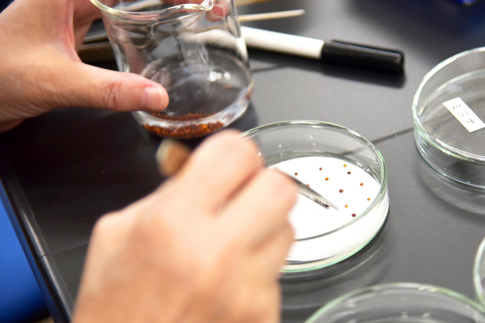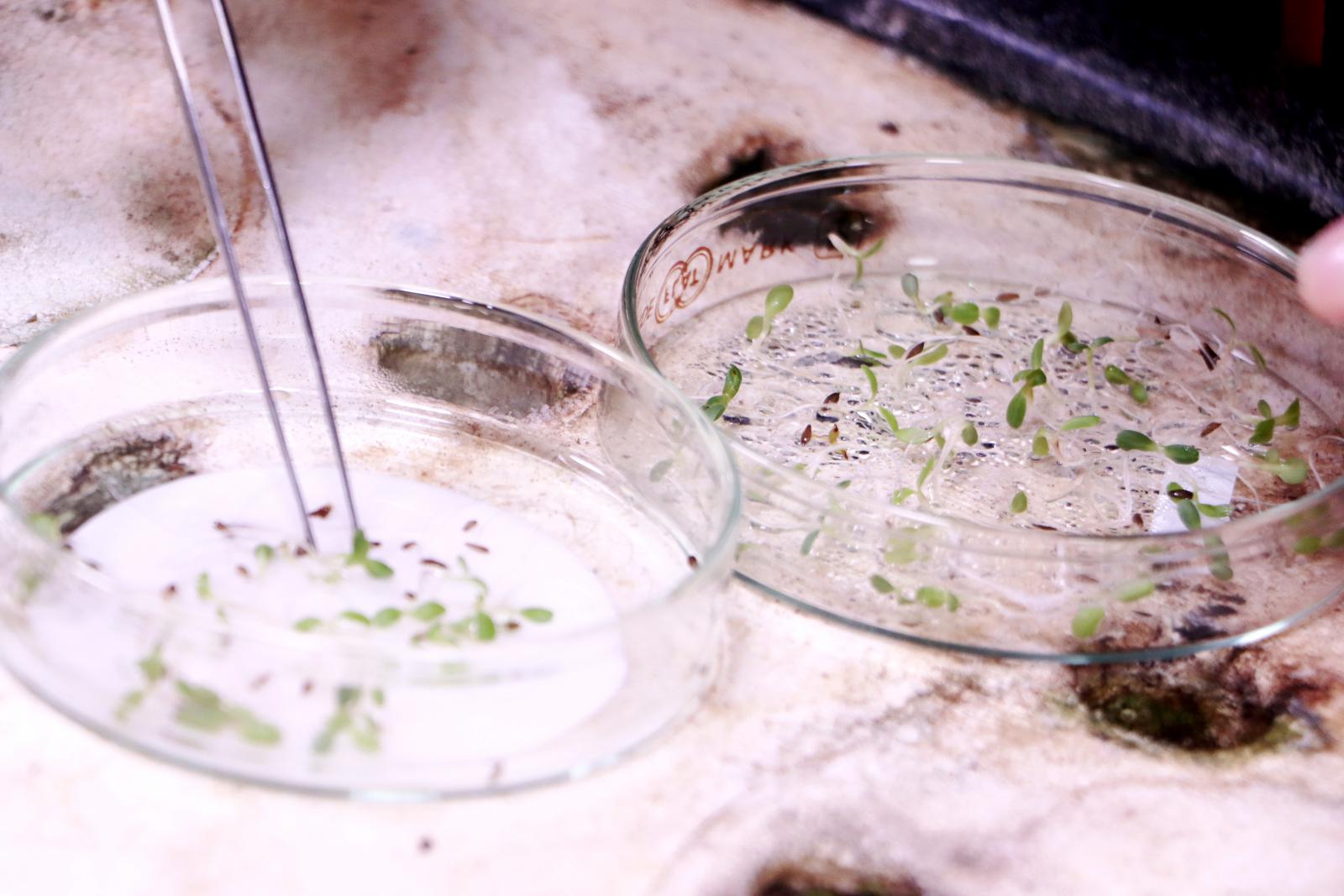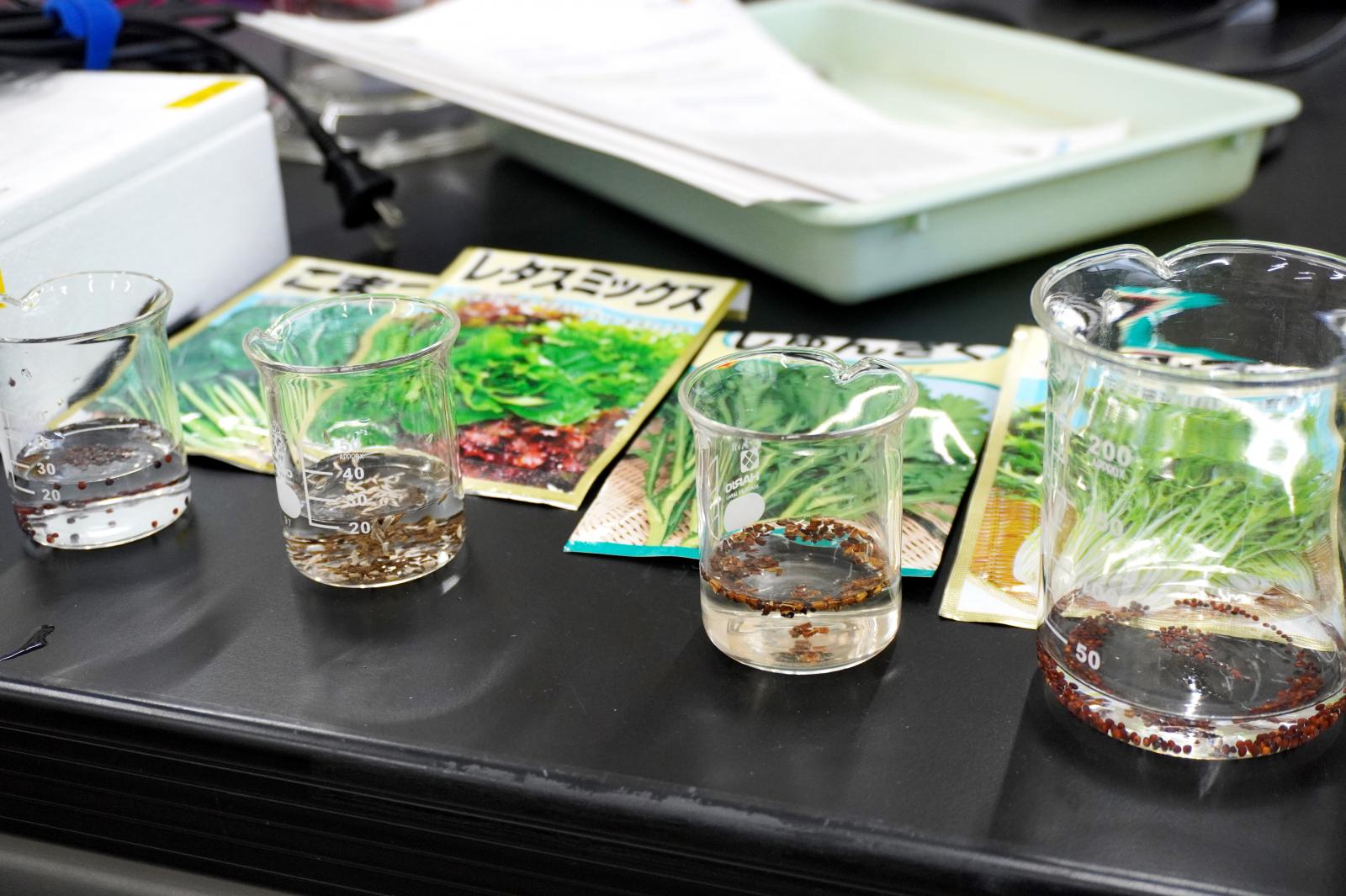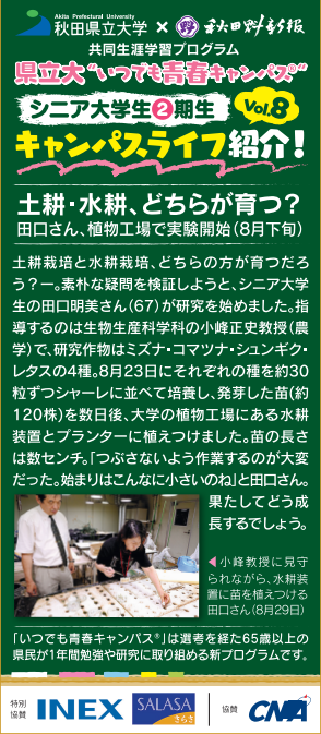 指導するのは生物生産科学科の小峰 正史教授[専門:環境調節工学]で、田口さんが研究の対象とした作物はミズナ・コマツナ・シュンギク・レタスの4種類です。8月23日にそれぞれの種を約30粒ずつシャーレに並べて培養し、1週間後、発芽した苗(約12粒)を秋田キャンパスの植物工場にある水耕装置とプランターに植え付けました。