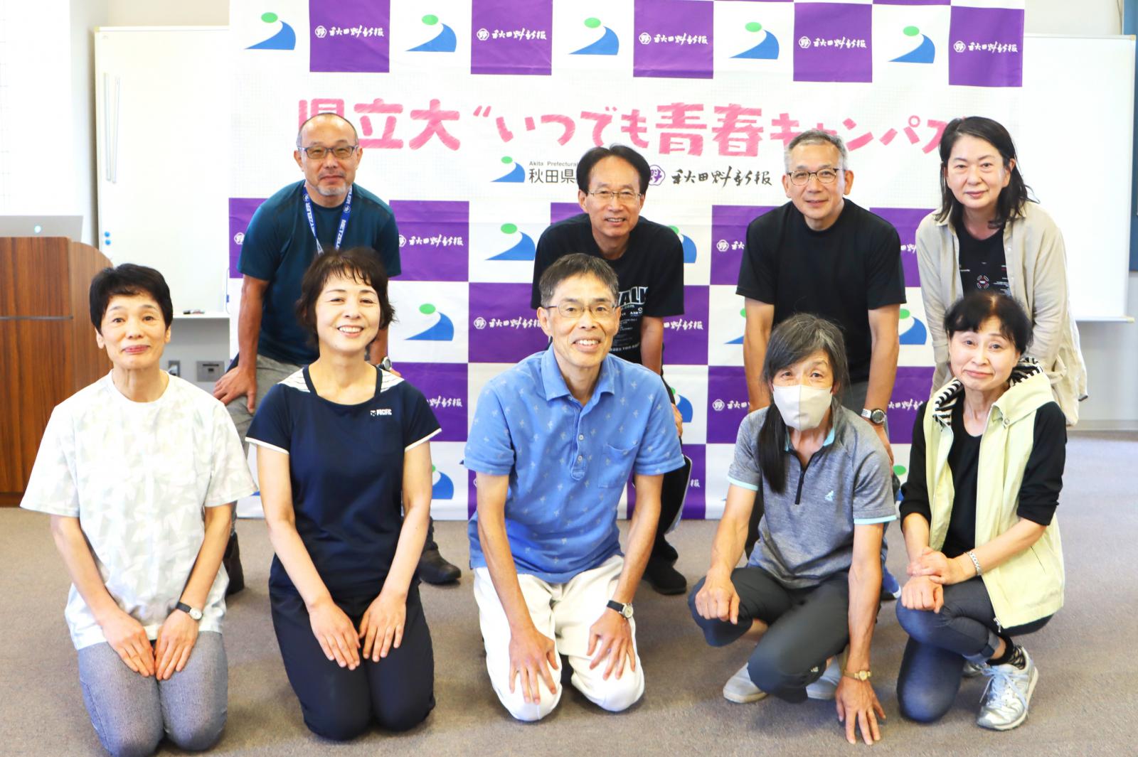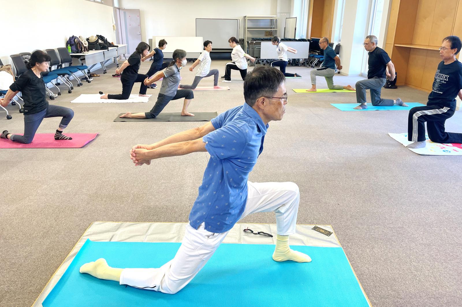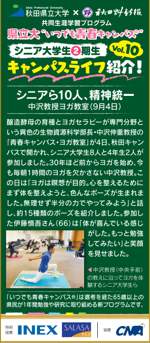 醸造酵母の育種とヨガセラピーが専門分野という異色の生物資源科学部長・中沢伸重教授[専門:分子育種学]のヨガ教室が9月4日、秋田キャンパスで開かれ、シニア大学生8人と4年生2人が参加し、本格ヨガに親しみました。