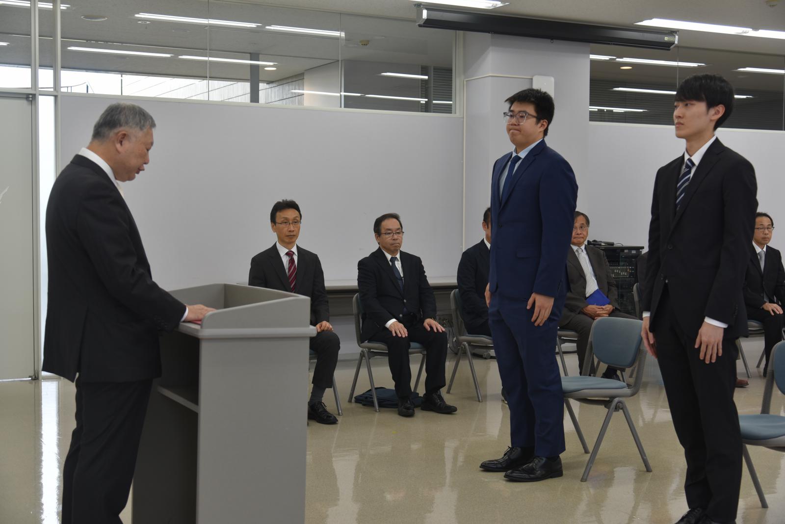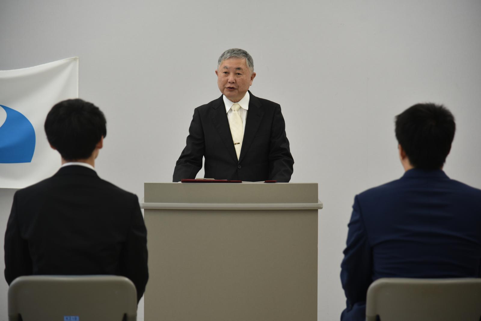 9月26日(木)に令和6年度後期大学院入学式が行われ、大学院生2名の入学が許可されました。式では、福田裕穂学長が「秋田県立大学は、今年で開学26年目を迎えました。この26年間に、世界では急速なグローバル化が進み、その中で重要なのは、既存の知識を身につけることではなく、自ら課題を設定してその課題にアプローチし、その中で真の知を身につけ、さらに新たな知を生み出すことです。大学院は、この未来社会で研究者・技術者として活躍するための訓練の場です。ここで、研究のスキルとともに、想像力、オリジナリティー、コミュニケーション力をぜひ磨いて欲しいと思います。大学院で大きく飛躍することを期待しています。」と式辞を述べられました。