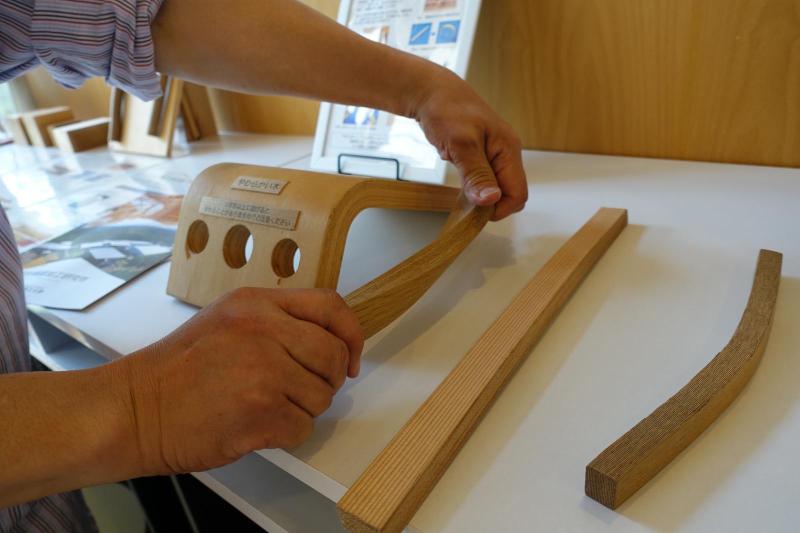 澁谷 栄准教授より、木材高度加工研究所の研究内容や地域との連携した様々な取組事例などについて説明があり、その後、所内を見学しました。エントランスには、研究所がこれまで企業などと共同開発した様々な製品が展示されており、シニア学生は、木材を加工した小物に触れたり、足立 幸司教授が(株)イトーキと製品化したバネバネ椅子「クルビス」に座ったりして、木材の温かみと薫りに癒された様子でした。また、複数の薄い板をゼリー状の接着剤で重ねて貼り合わせることにより、簡単に曲げたり、ねじったりできる世界初の木質素材「やわらかい木」を実際に触ってみると、木が曲がるという現象に「信じられない~!」と驚く様子も見られました。