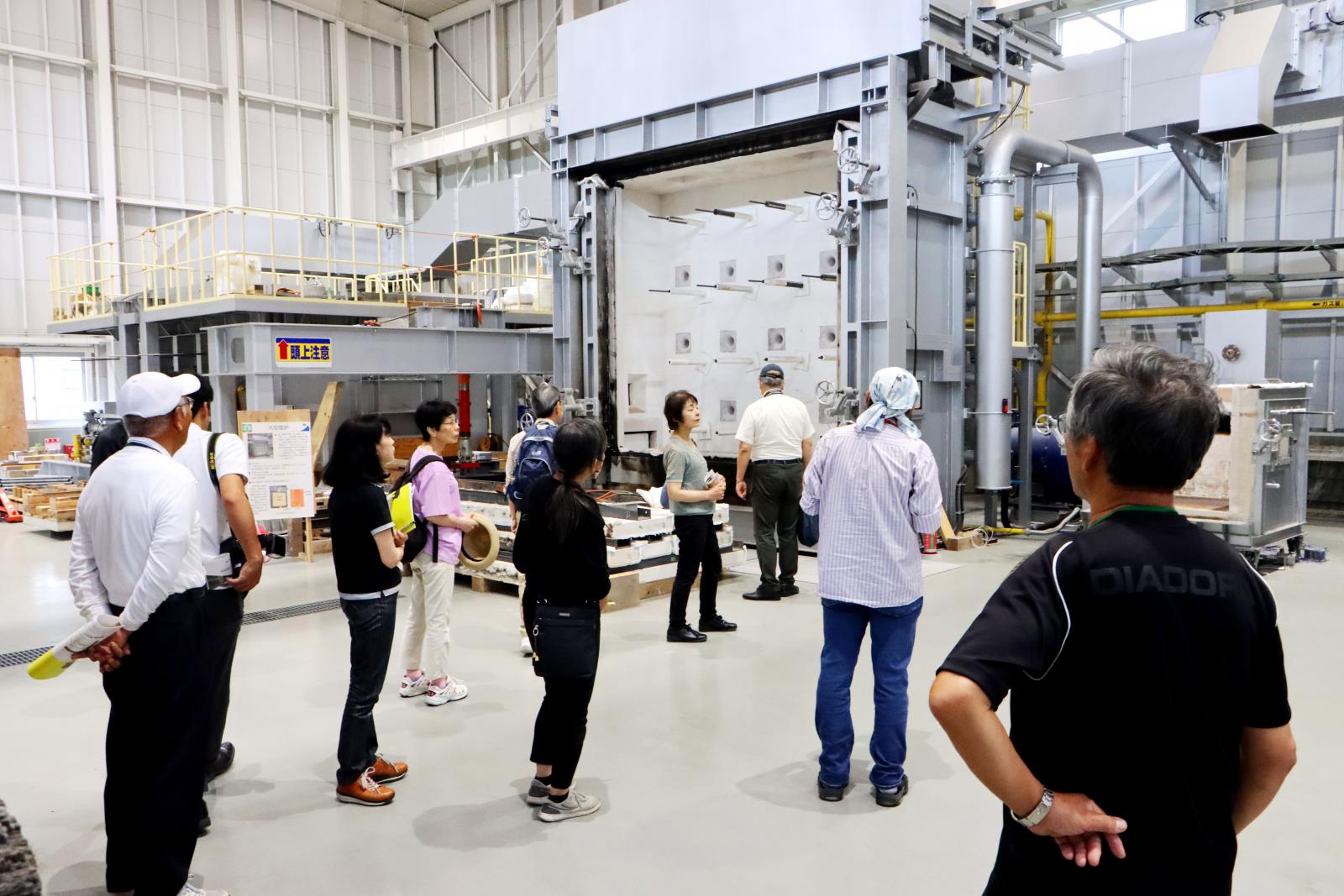 続いて、プレスや乾燥装置などを備える「試験棟」や、巨大な炉がある「耐火試験棟」などを見学しました。耐火試験棟内には、建築部材の耐火性能を実際の大きさで試験することができる水平炉、壁炉、柱炉が設置されています。試験棟には、構造研究・実験などに用いる大型試験機や、プレスや木材乾燥装置など実大の加工実験用装置を備えています。これらの設備について、「どのくらいの量の試験をできるのか」「どのような仕組みなのか」など質問が飛び交いました。