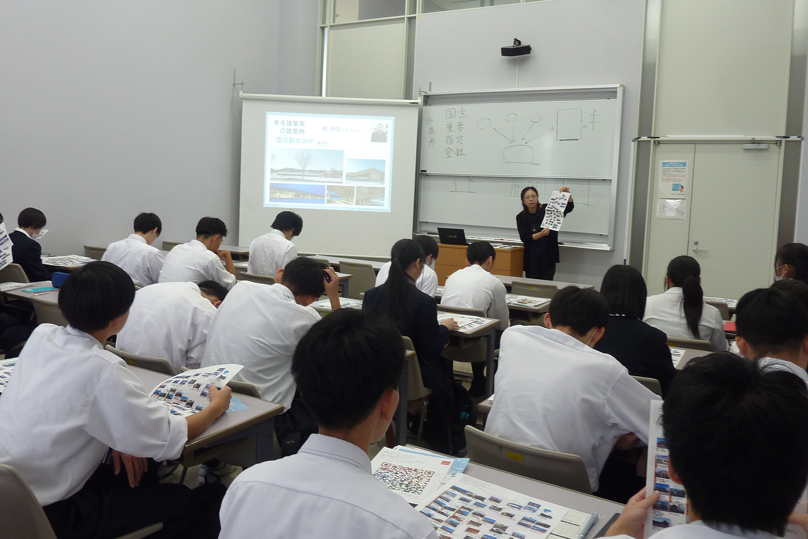 はじめに秋田県立大学の概要や特徴、システム科学技術学部ではどんなことが学べるのか説明を受けた後に、建築環境システム学科 石山真季 助教の模擬講義を受講しました。「建築のみかたー『人間生活の場』の総合デザイン」と題し、大学で学ぶ建築とはどのような分野があるのか、建築の三要素である「強・用・美」について学びました。講義内では、秋田県内にある有名な建築物の特徴や優れた点などが紹介され、「建築学」という学問への理解を深めました。高校生からは、「これまで何気なく見ていた建物や街並みを新たな視点から捉えることができた」と感想が上げられました。