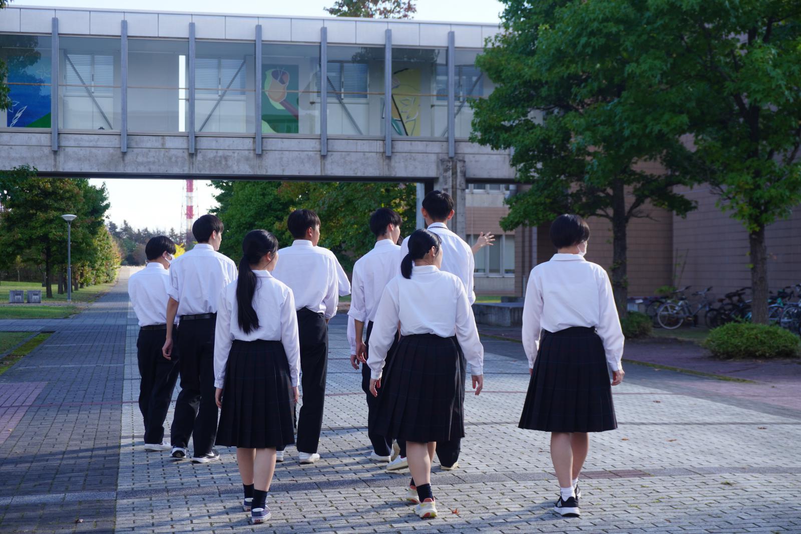 模擬講義のあと、研究棟や図書館、キャリア情報センターなど、秋田キャンパス内を回りました。見学中には、学内を歩いていた横手城南高校出身の先輩から、「実践的な研究ができるのがすごく楽しい。ぜひ県大に来て、一緒に勉強しよう!」と声をかけてもらう場面も見られました。