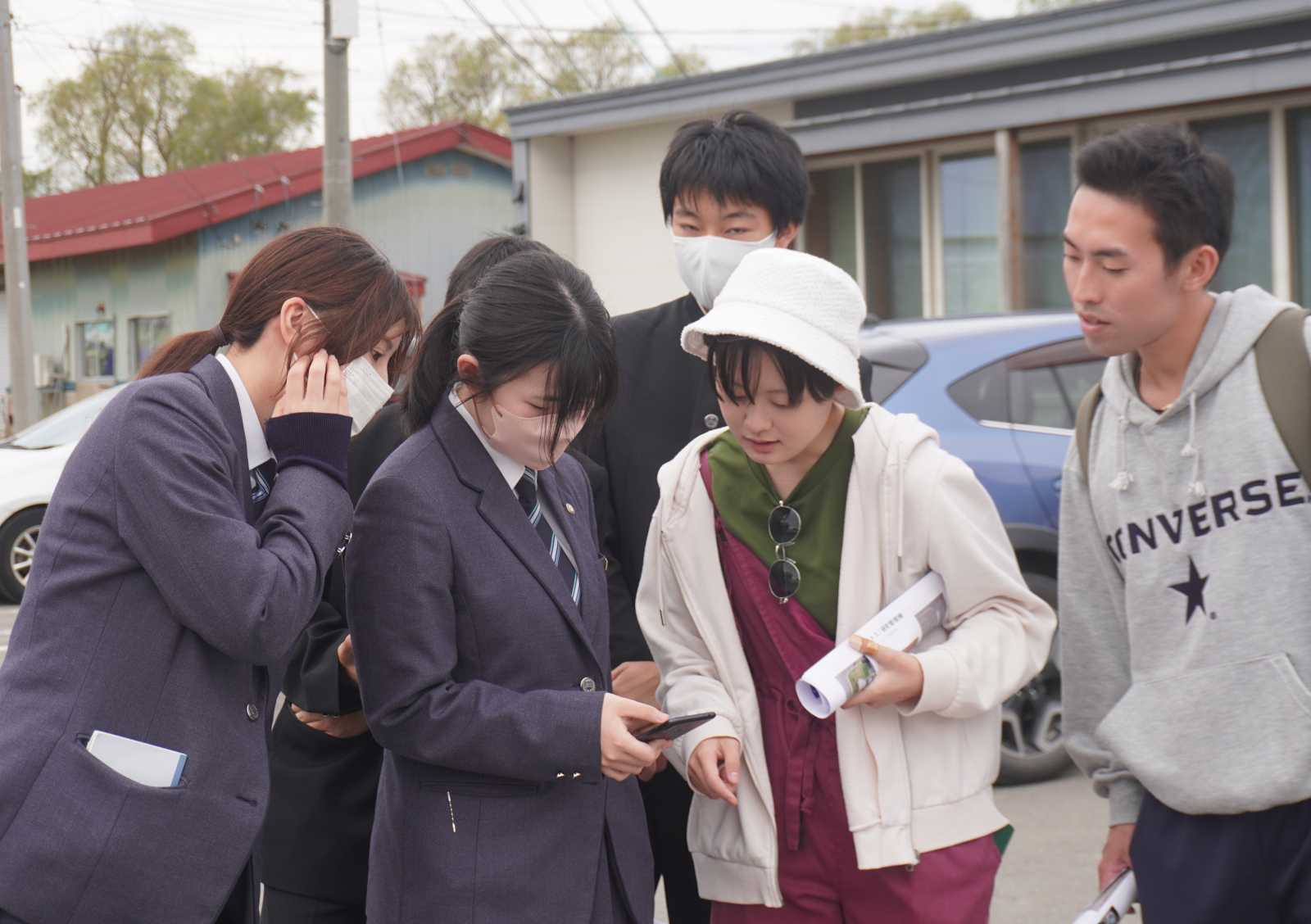説明のあと、アグリイノベーション教育センターの西村洋 特任教授、生物資源科学部アグリビジネス学科の山本聡史 准教授より「自分の位置が正確に分かる仕組み」をテーマに体験授業が行われました。紹介された農業技術の中から位置情報に焦点を当て、スマートフォンと専用機器の2つの機器を手に持ち、AICの建物周辺を歩きデータを収集しました。アグリビジネス学科3年生の学生も参加し、高校生の皆さんと協力しながら実験に臨みました。