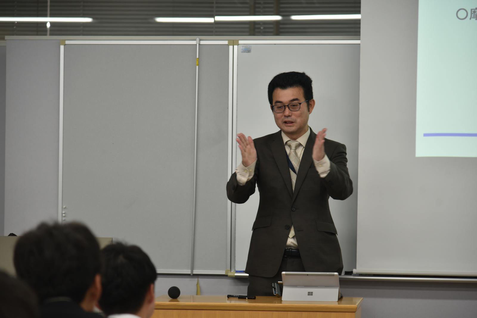 施設見学として、加工工場、電波無響室、建築構造実験室、創造工房といった高等学校ではなかなか見られない施設や設備を見学しました。特に電波無響室では、知能メカトロニクス学科の戸花照雄准教授から電波無響室の中に入るとスマートフォンが繋がらなくなる現象について説明を受け、興味深そうに自身のスマートフォンを眺めていました。大学概要説明の後に機械工学科の野村光由准教授より「ものづくりに役立つ基礎物理(力学)~ものづくりと機械加工~」という題目の模擬講義を受講しました。講義の中では、日本と海外のものづくりの違いや知識者・知恵者の違いについて触れる場面があったり、高等学校の物理では軽く触れられるだけの「摩擦」について大学ではどのように学問として深掘りしていくのかといった説明があったりし、学生はいつも以上に集中して講義に参加しているようでした。