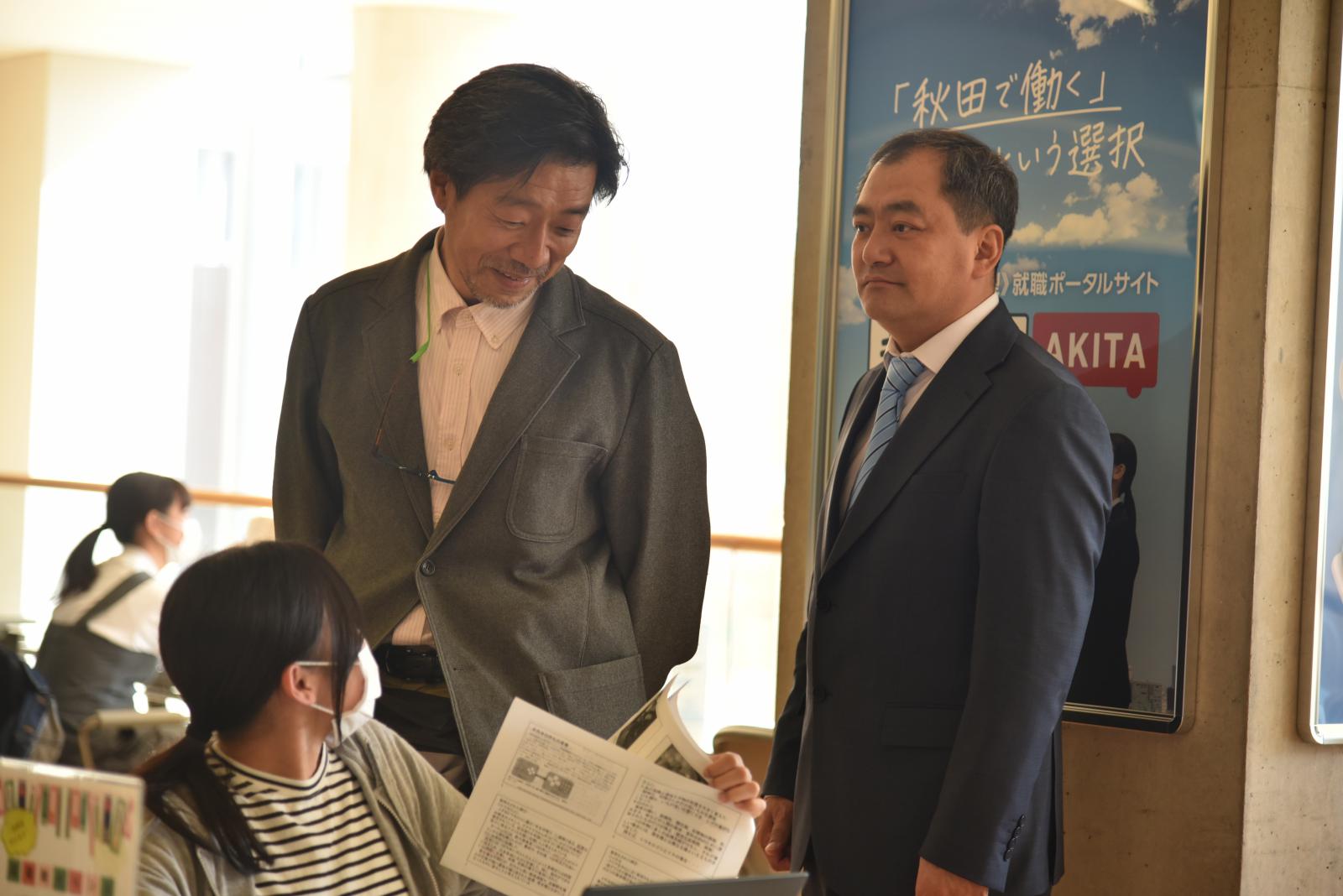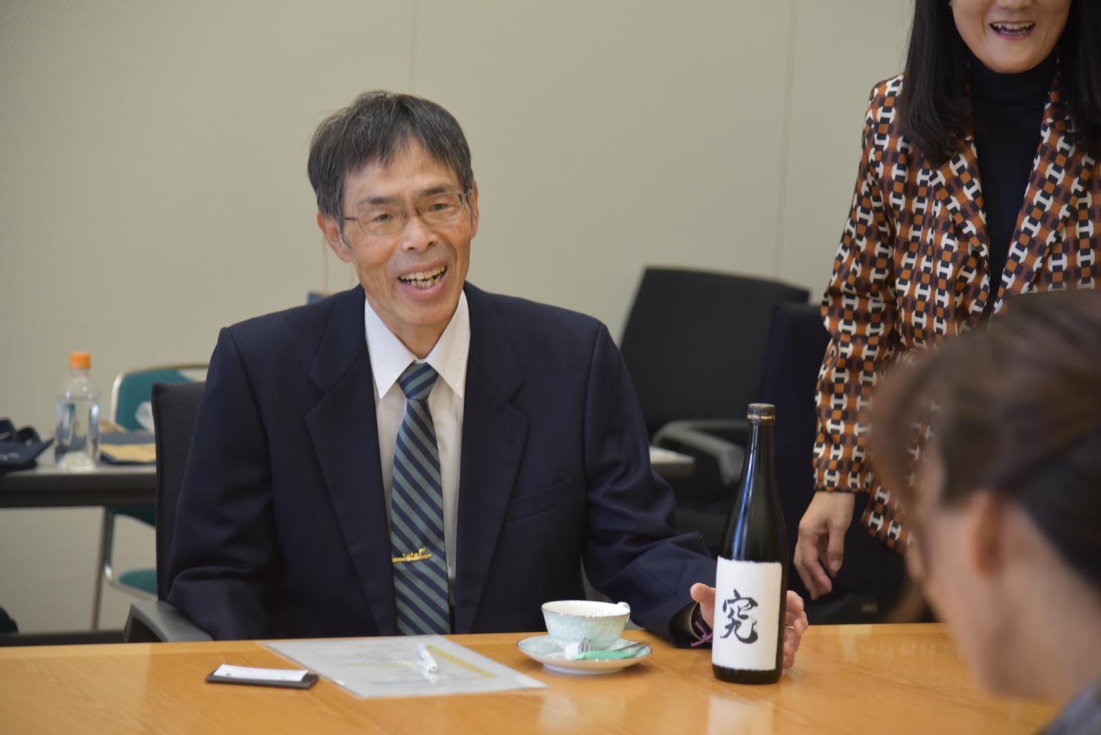 会談後には、秋田キャンパス内を見学しました。まずはじめに、講堂やカフェテリアを見学しました。講堂を見た際には、「講堂の形がゲルのようだ」と感想を述べていました。また、カフェテリアでは自習をしている学生と訪問団が談笑している様子が見られました。その後、醸造学実験研究室や生物環境科学科の機器分析室を見学しました。特に、醸造学実験研究室では、究プロジェクトを率いた伊藤俊彦准教授からお話を伺う場面が見られました。