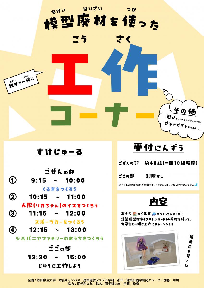 由利本荘プロモーション会議のイベント「おさがり交換会&手づくりダンボール迷路」の協力を得て、本学科3年の加藤さん、中川さん(指導教員:石山真季助教)が企画した「親子工作教室」が10月20日(日)旧石沢小学校にて開催されました。普段は捨てられてしまう建築模型材料の廃材―古く変色していたり中途半端で使いにくい大きさのもの―をリサイクルして、スポーツカーや人形のおうちなどの工作キットを考案し、準備して臨んだところ、約60名(約40組)ものお子さまに工作を体験して頂くことができました。至らぬところが多々ございましたが、おさがりっこメンバーの皆様をはじめ、由利本荘市地域づくり推進課の皆様、石沢地区の皆様には、多大なるご支援、お力添えを賜り、心より感謝申し上げます。また、ご来場の皆様からは、温かい励ましのお言葉のほか、とても楽しかった、などの嬉しいご感想をたくさん頂戴し、誠にありがとうございました。準備・運営にご協力くださった本学科3年鈴木さん、2年伊藤さん、松橋さん、道具等をご提供くださった創造工房のご担当者様にも改めてお礼申し上げます。