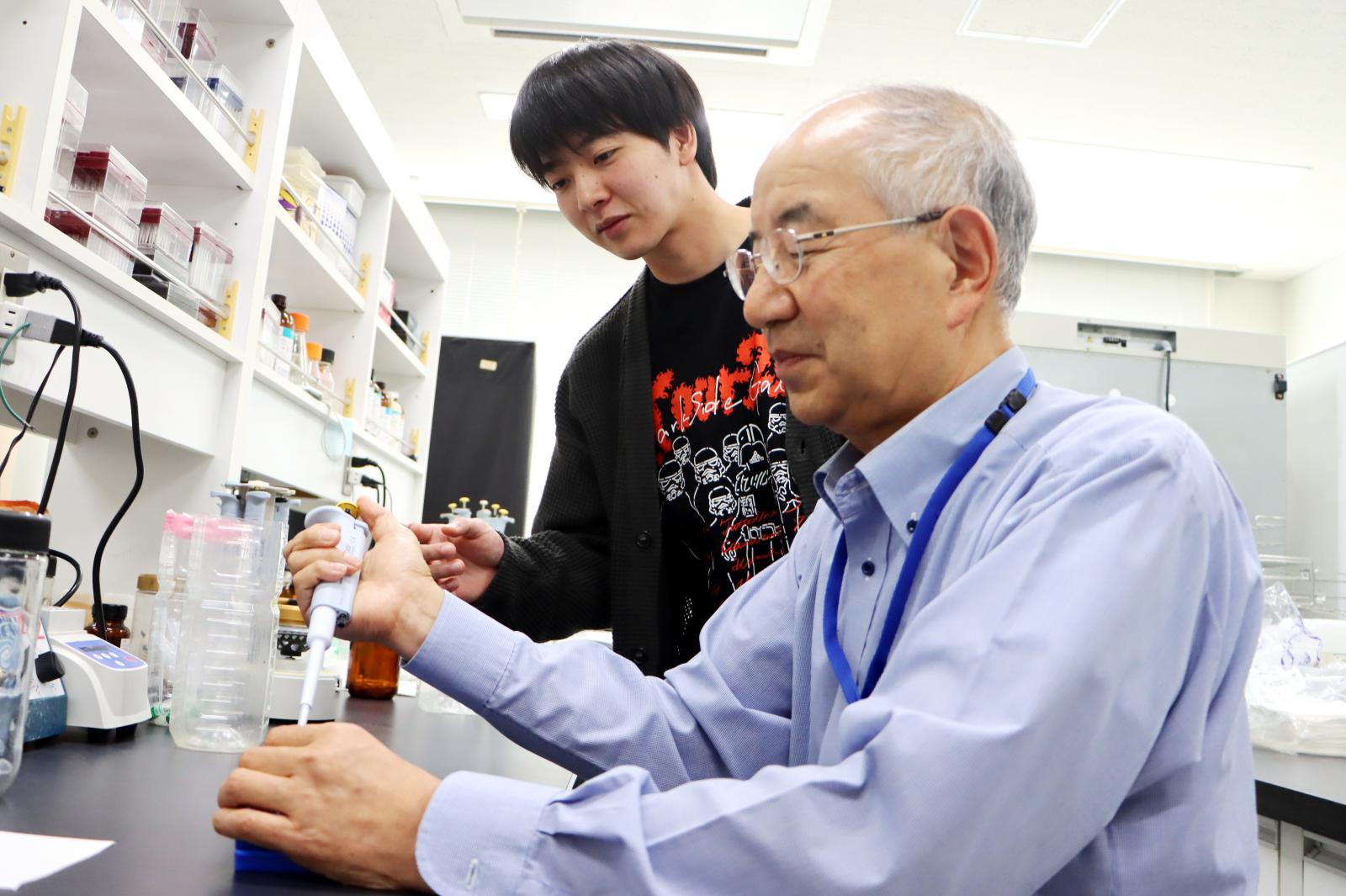 シニア大学生の羽沢 均 さん(68歳)は、生物生産科学科/植物保護研究室の「植物のお医者さん」、藤 晋一 教授[専門:植物病理学]の指導の下、趣味の家庭菜園で病気になってしまった野菜や果実から、病原菌を特定する研究に取り組んでいます。羽沢さんの研究は、同研究室に所属する大学院・生物資源科学研究科の齋藤 唯人 先輩(前期課程1年生)が指導しています。
