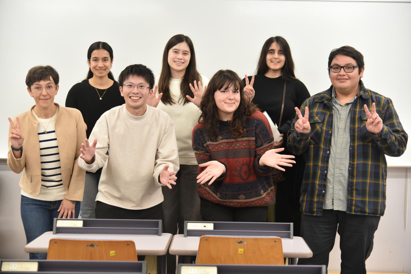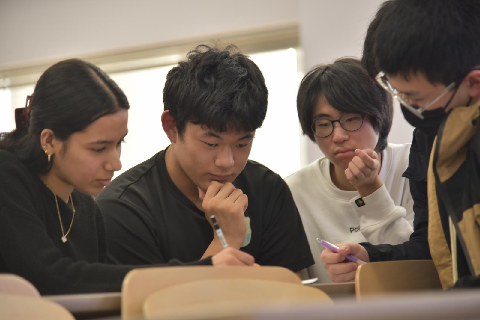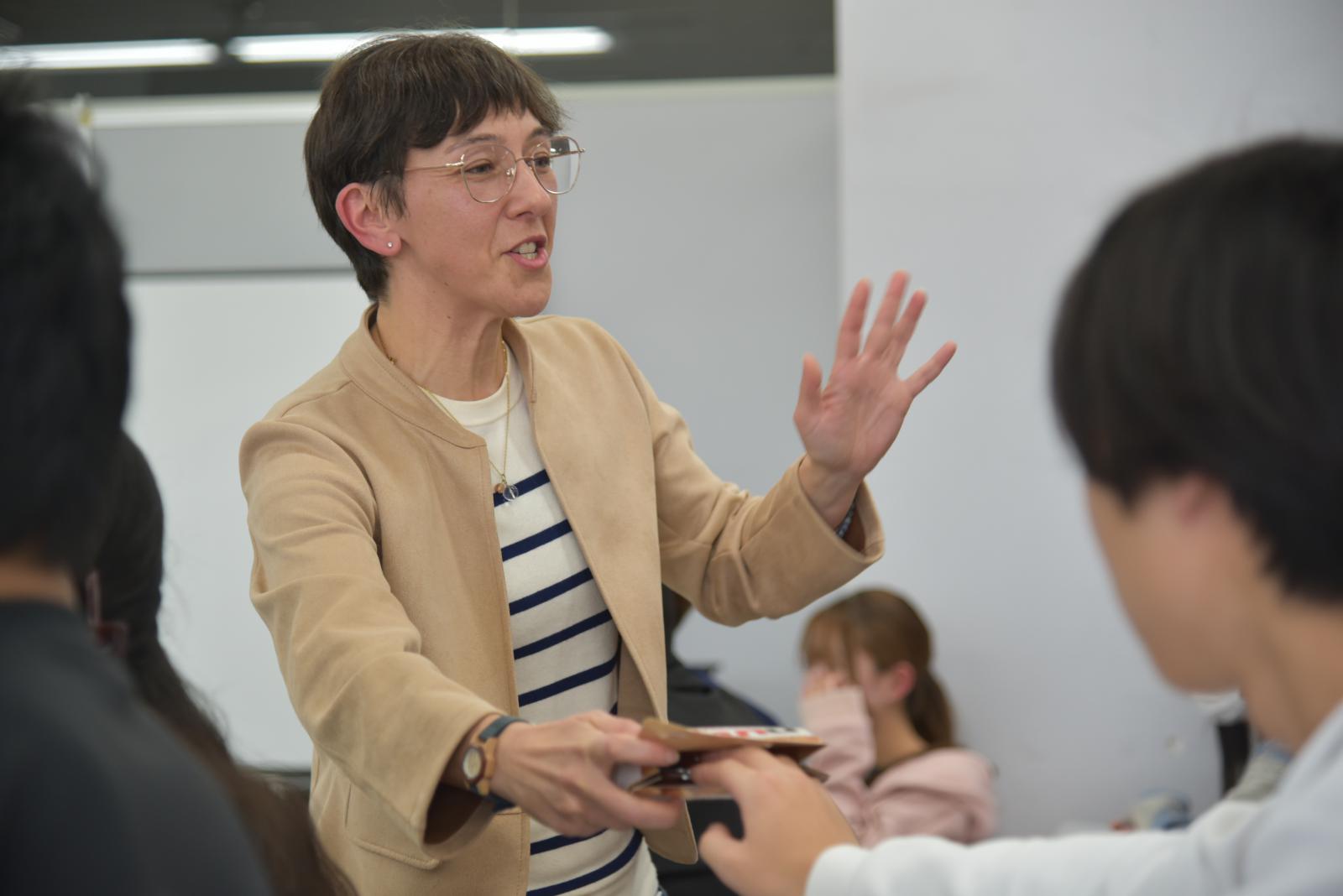 本事業には各国からの留学生5名が参加しました。留学生は、本学総合科学教育研究センターのアヴァンツイ マリア カルロッタ 助教が担当する「科学英語基礎」の講義に参加し、受講生と共にクイズに取り組みました。講義中は留学生と受講生が協力してクイズに取り組む姿が見られ、中には一番早くクイズに正解し、商品をもらうグループもありました。