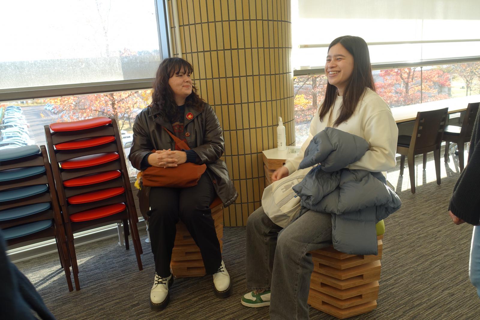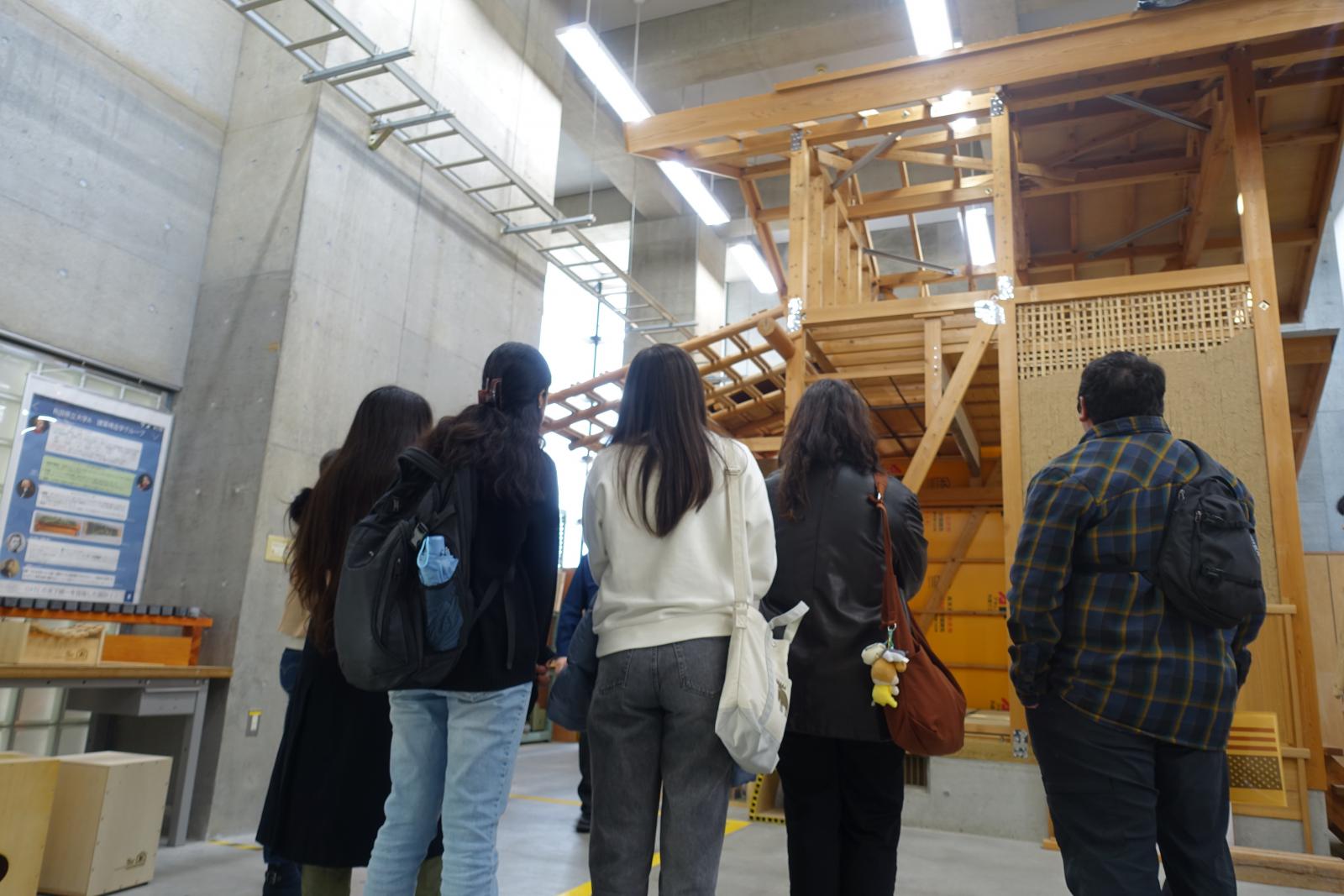 講義後には、キャンパス見学が実施され、創造工房や特別実験棟といった本学の特徴的な場所を見学しました。見学の最中には、バネバネの椅子を体験し、その不思議な感覚に驚いていました。最後には、英語クラブ所属の学生との交流会が行われました。留学生の英語に苦戦する様子も見受けられましたが、自身の専門分野や留学中の体験を伝えていました。
