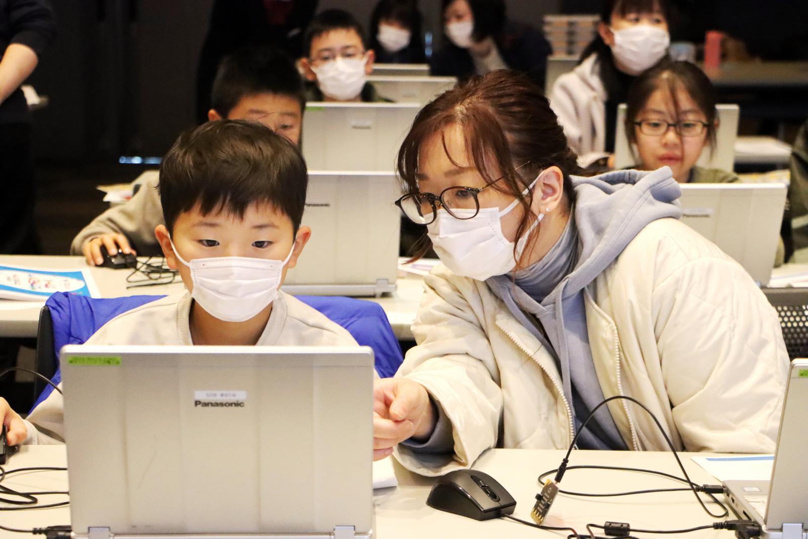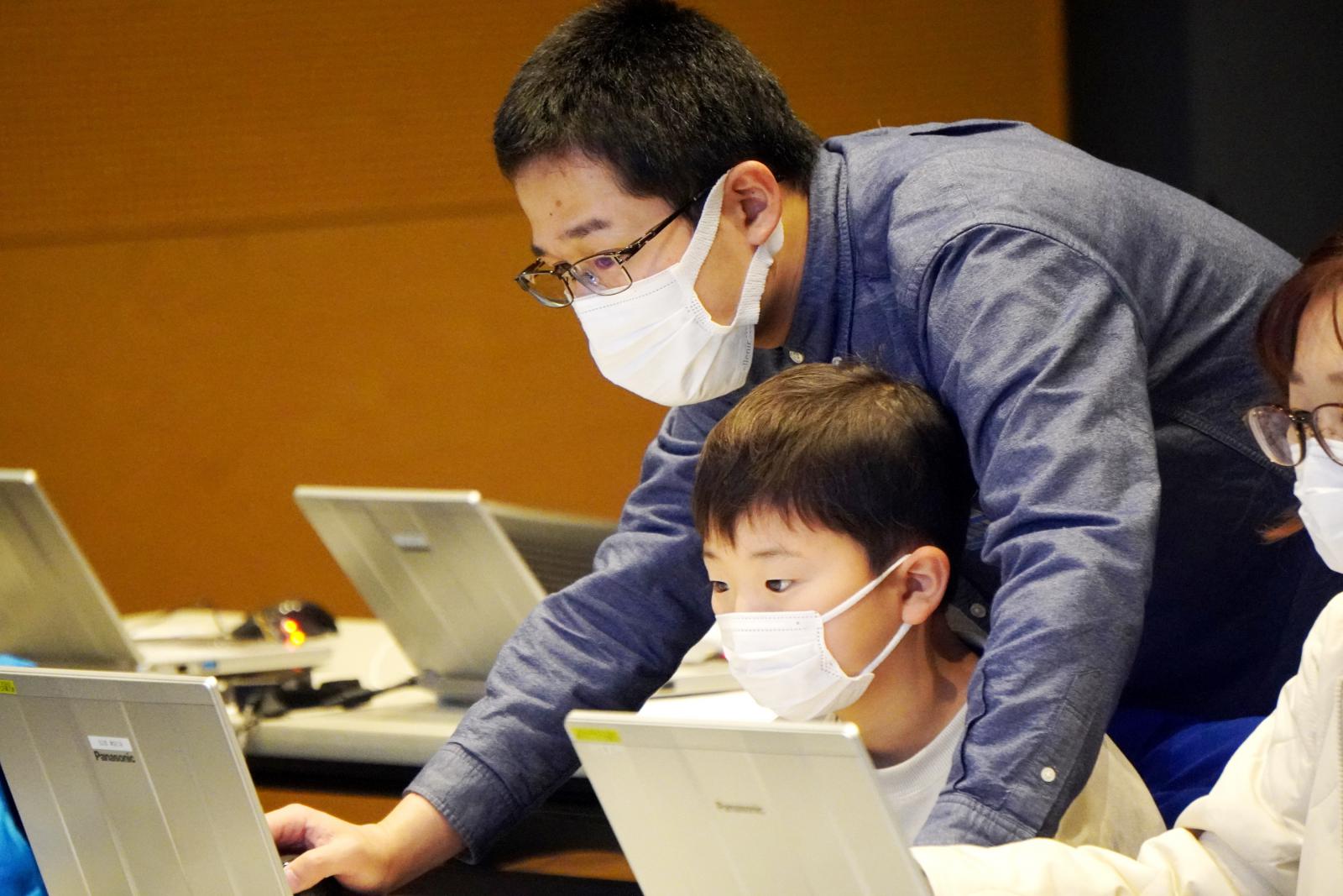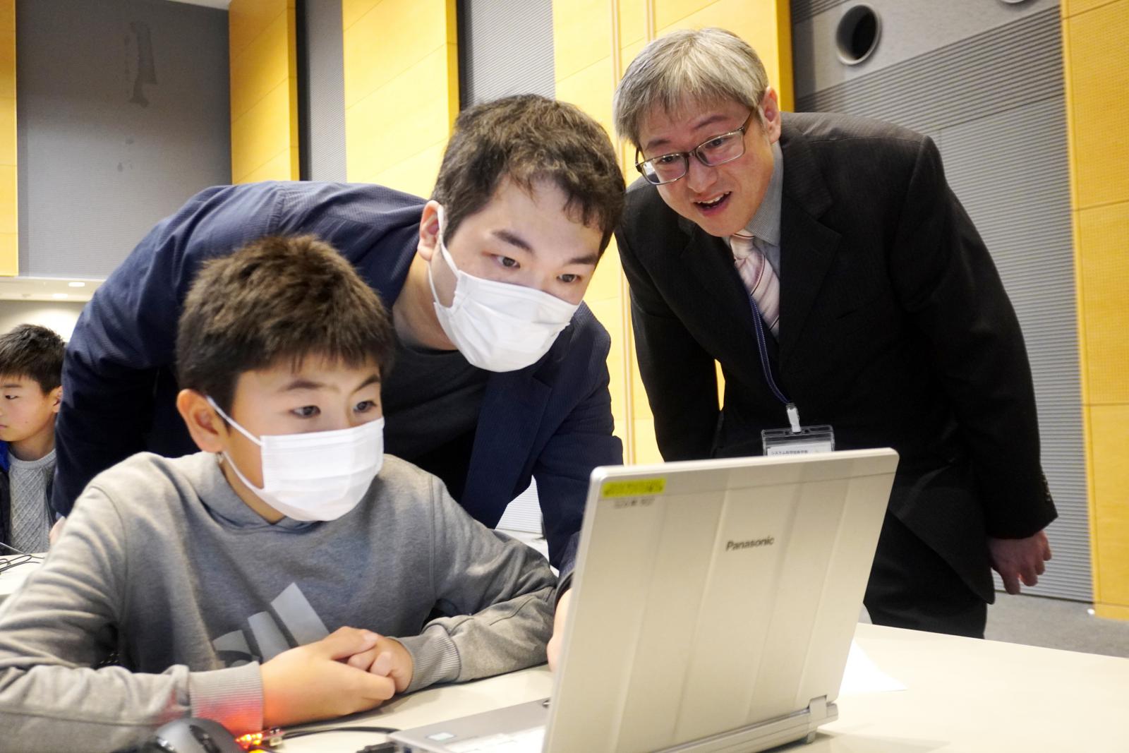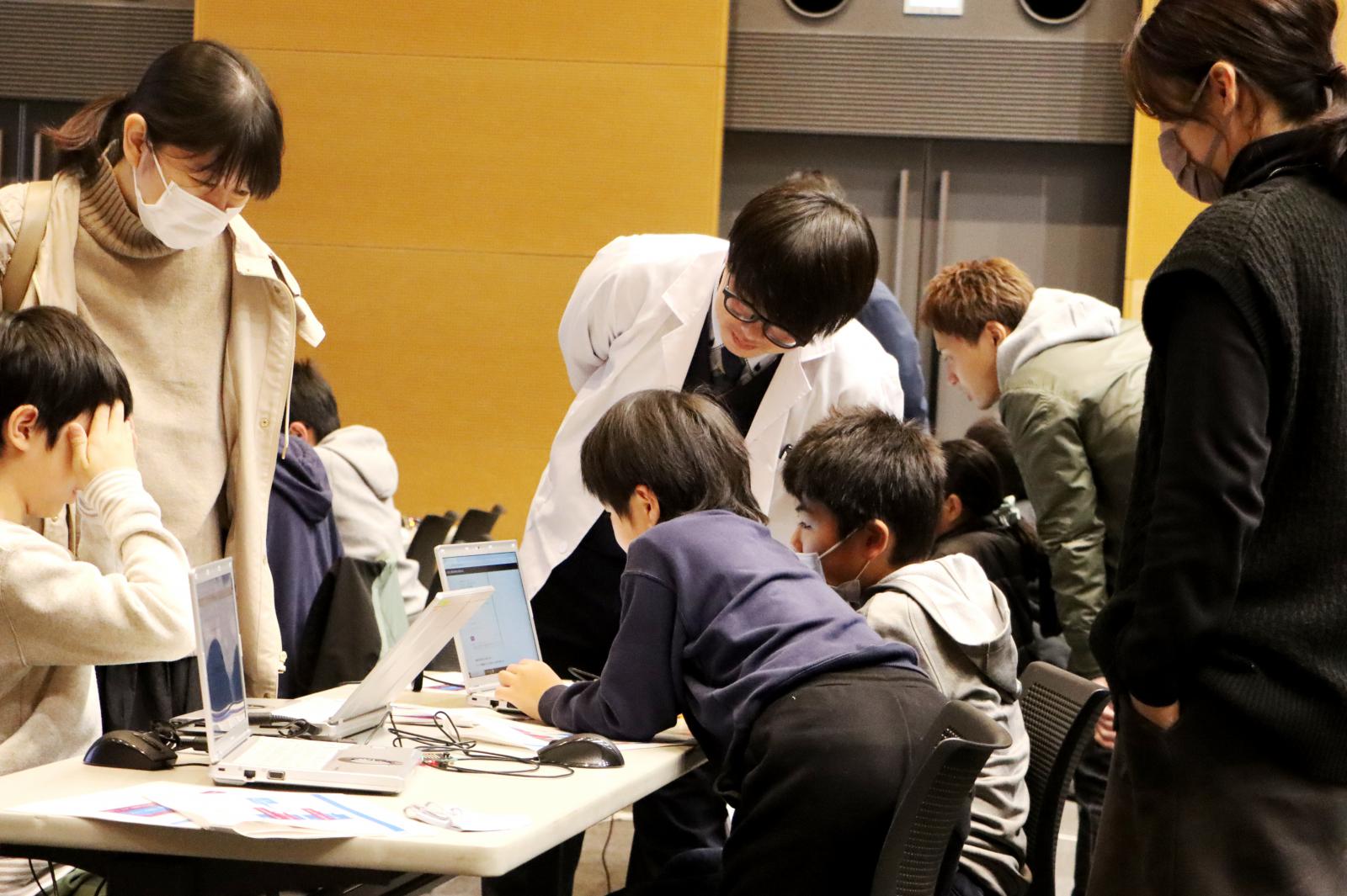 同イベントの一環として、廣田 千明 准教授らが講師を務める、「プログラミングスクール」が開催され、小学生および保護者が参加し親子揃ってプログラミングの魅力を体験しました。スクールでは、本学の学生やシステム科学技術学部・電子情報システム学科(現在の情報工学科)を卒業された秋田市立広面小学校の本田 和也 先生、ICT支援員の鈴木 克 さんが授業をサポートしました。「緊急地震速報のプログラムを考えてみよう!」