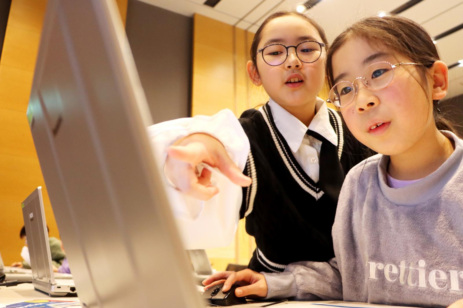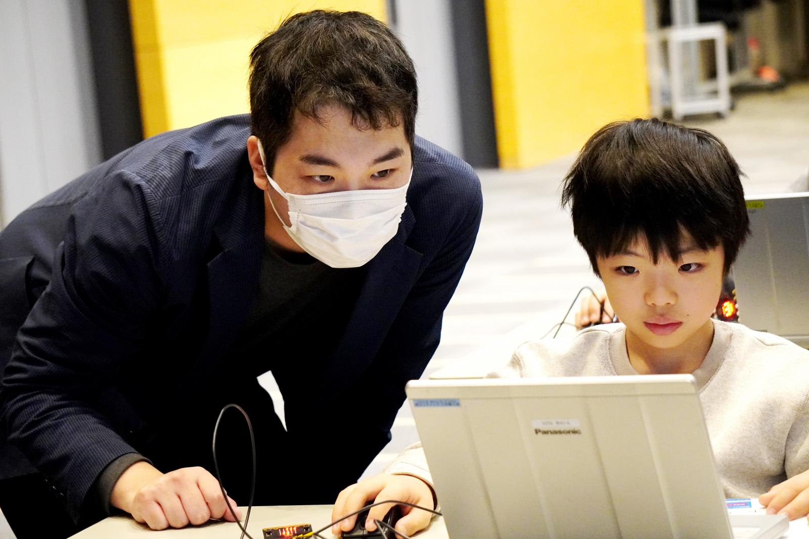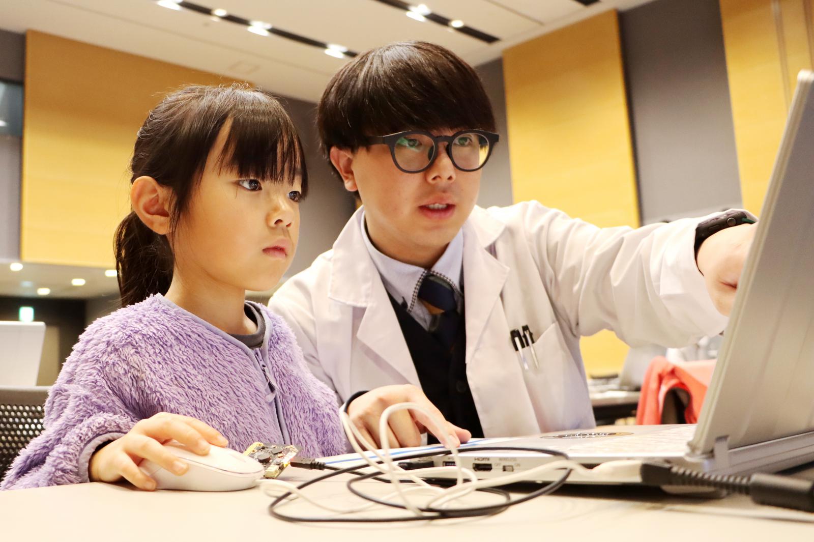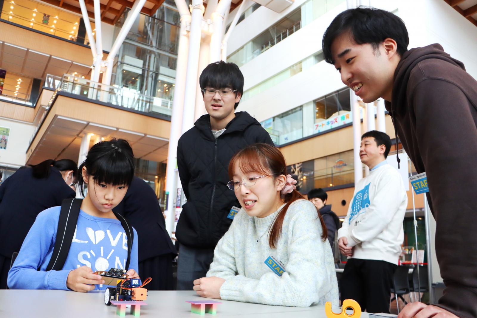 同イベントの一環として、廣田 千明 准教授らが講師を務める、「プログラミングスクール」が開催され、小学生および保護者が参加し親子揃ってプログラミングの魅力を体験しました。スクールでは、本学の学生やシステム科学技術学部・電子情報システム学科(現在の情報工学科)を卒業された秋田市立広面小学校の本田 和也 先生、ICT支援員の鈴木 克 さんが授業をサポートしました。「緊急地震速報のプログラムを考えてみよう!」