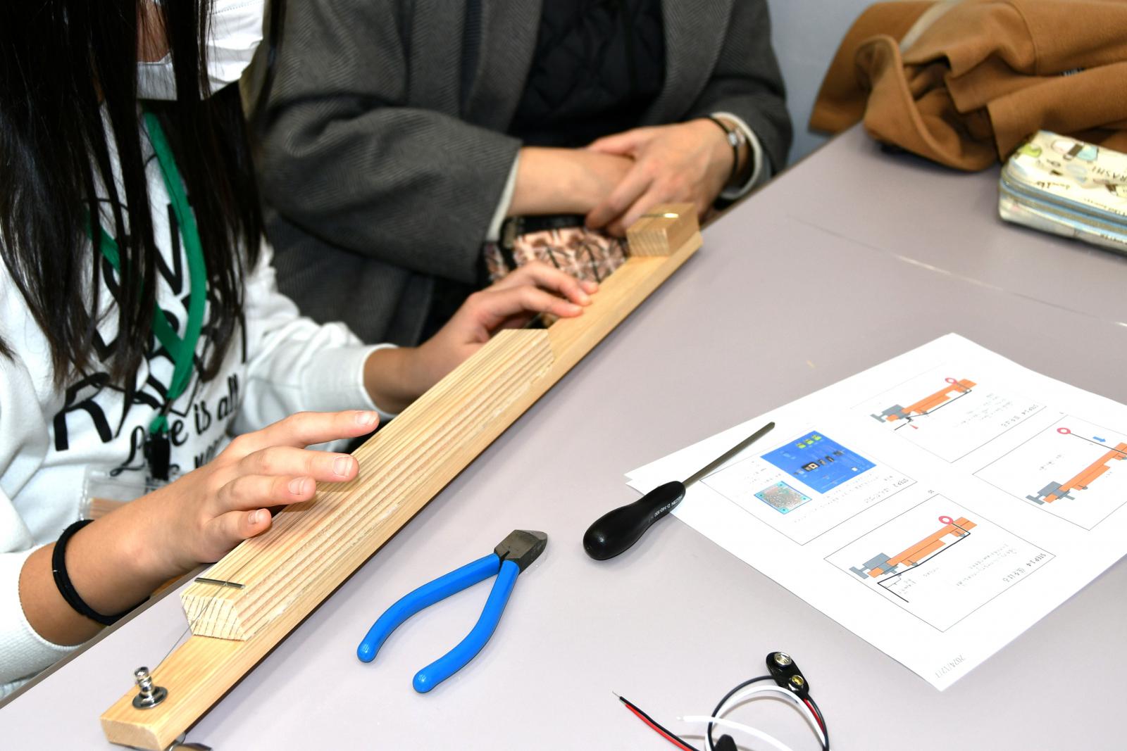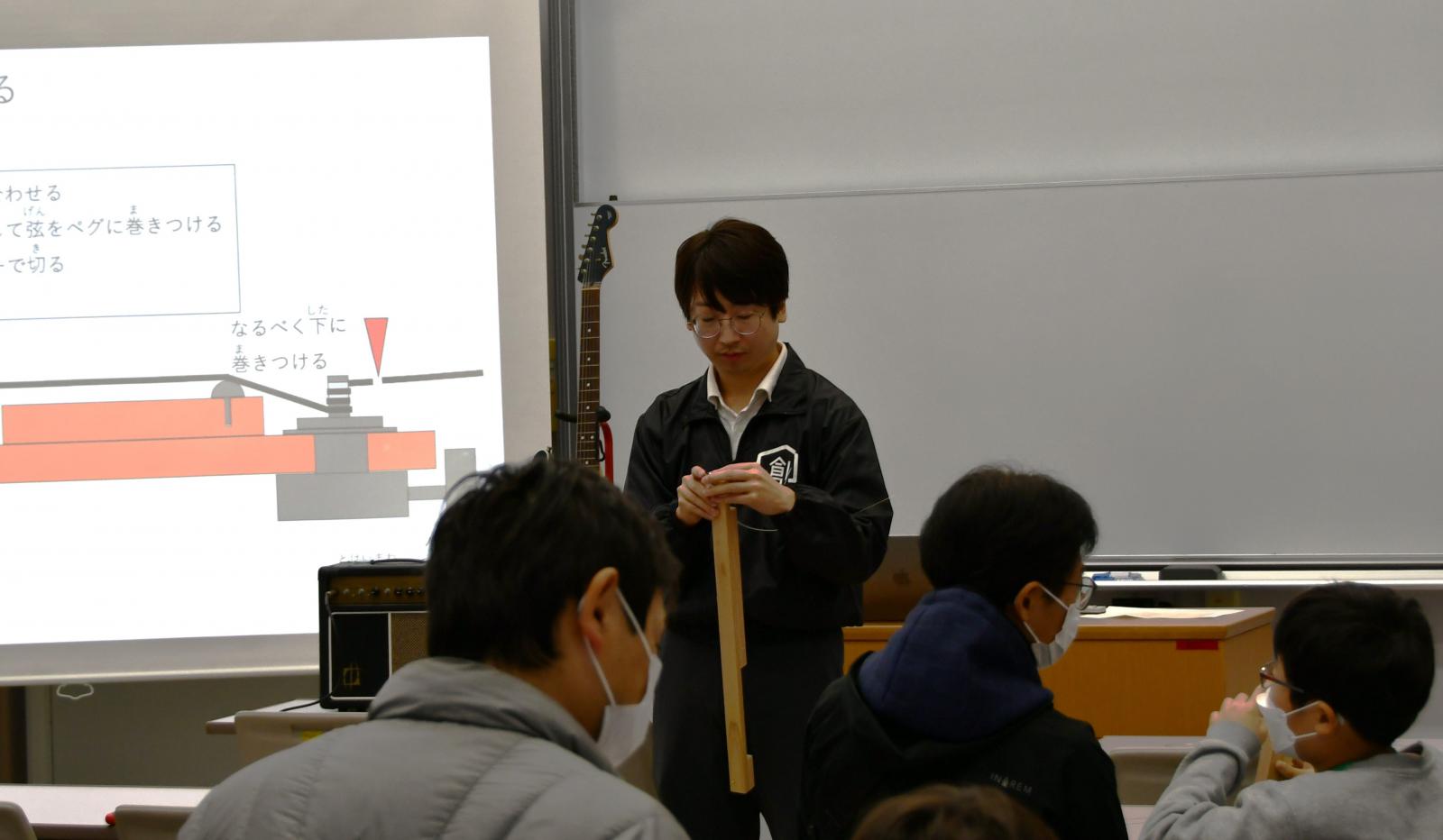 音が出る仕組みを学んだあとは、エレキギター作りに挑戦し、おうちの方や学生ボランティア、教員と協力しながら完成させました。
