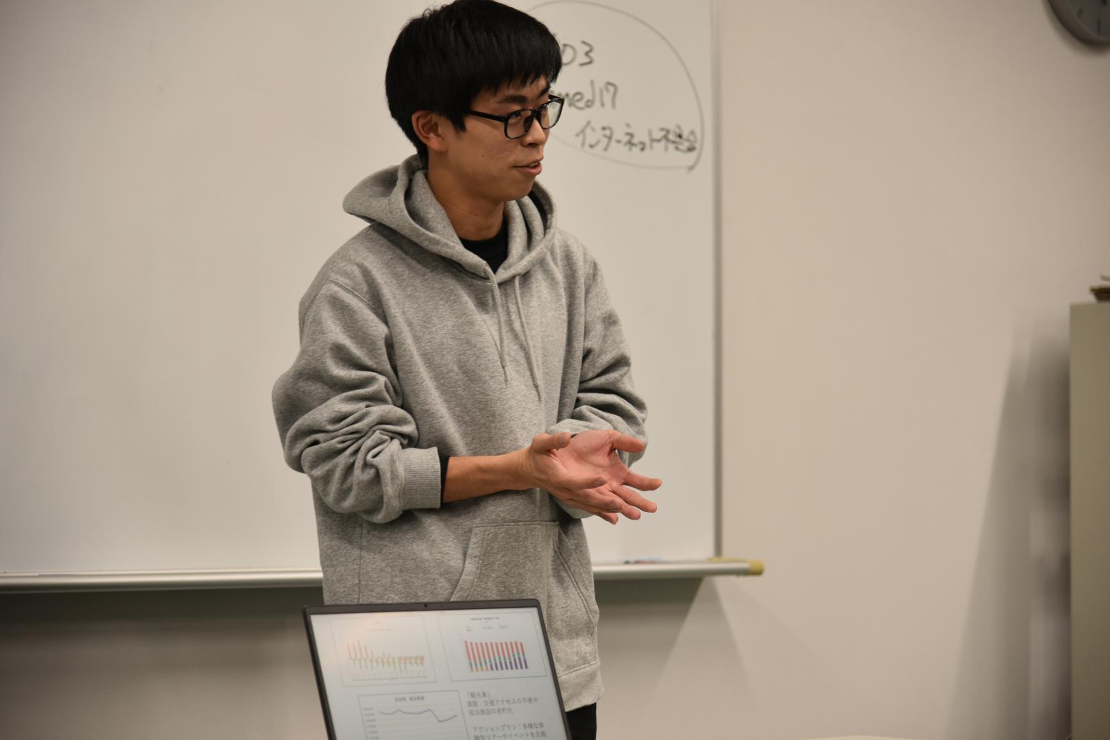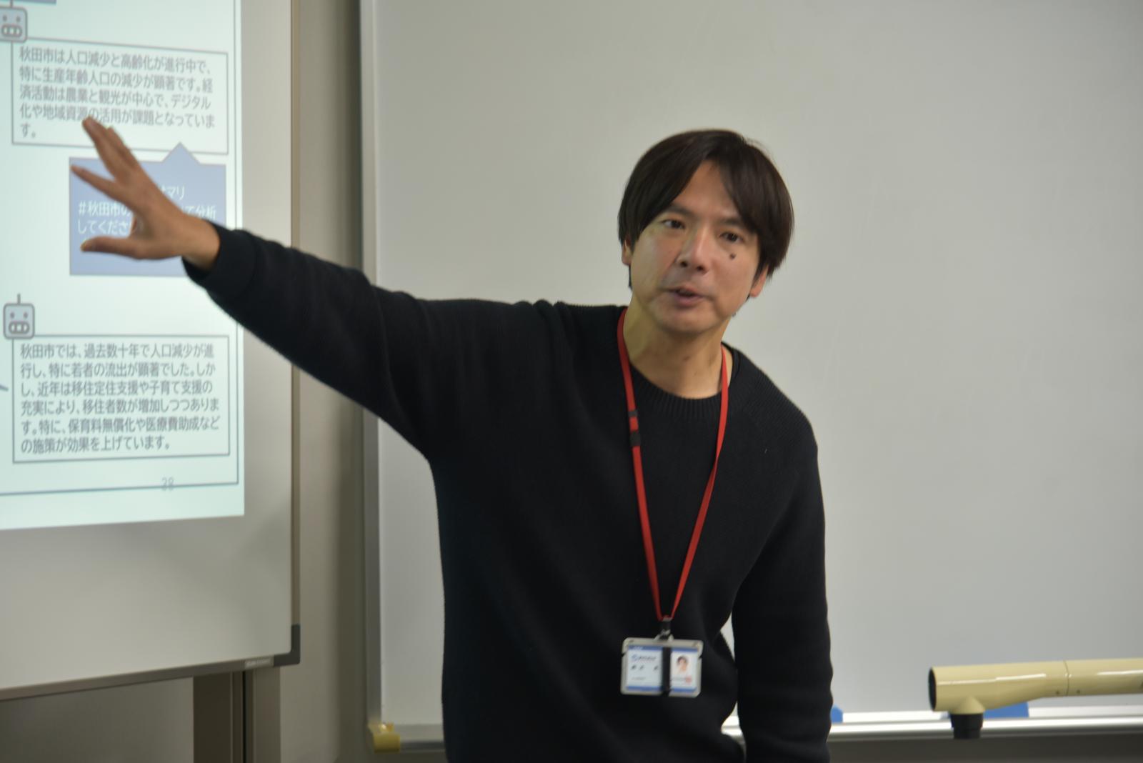 学部生を対象とした「あきた地域学アドバンスト(担当教員:経営システム工学科 嶋崎真仁教授)」授業の一環として、12月16日、本荘キャンパスにて、東日本電信電話株式会社秋田支店の協力のもと、「データサイエンティスト育成を目指したワークショップ」を開催しました。今回のワークショップは、まちの課題と課題解決をテーマとして、データ分析の重要性とデータサイエンスのスキルの習得を目的として開催されました。