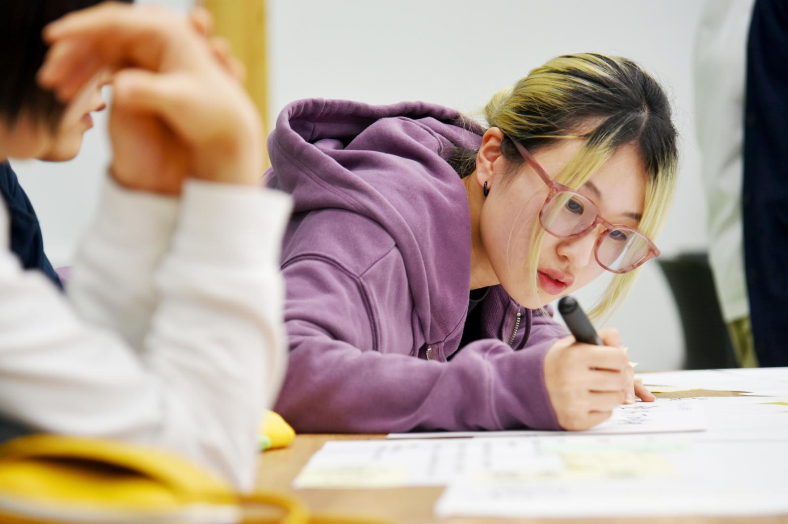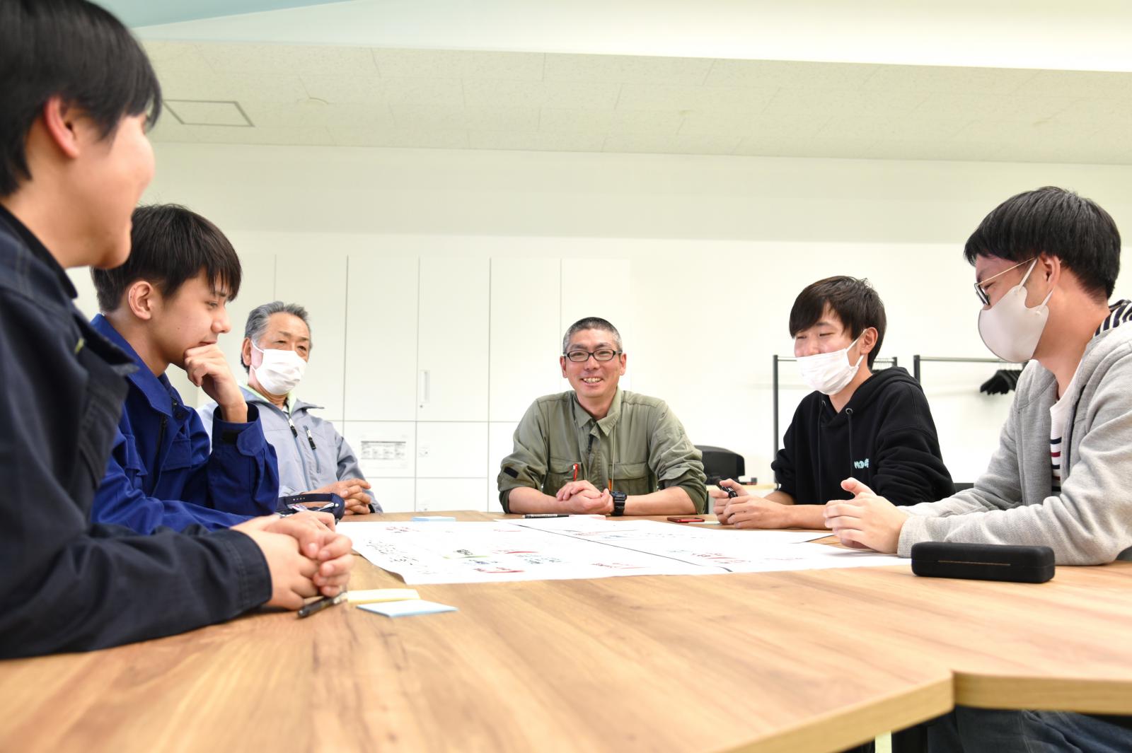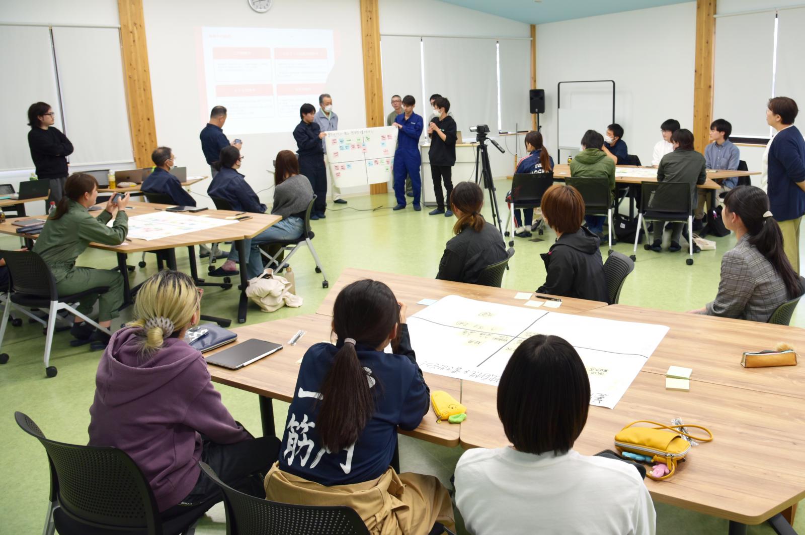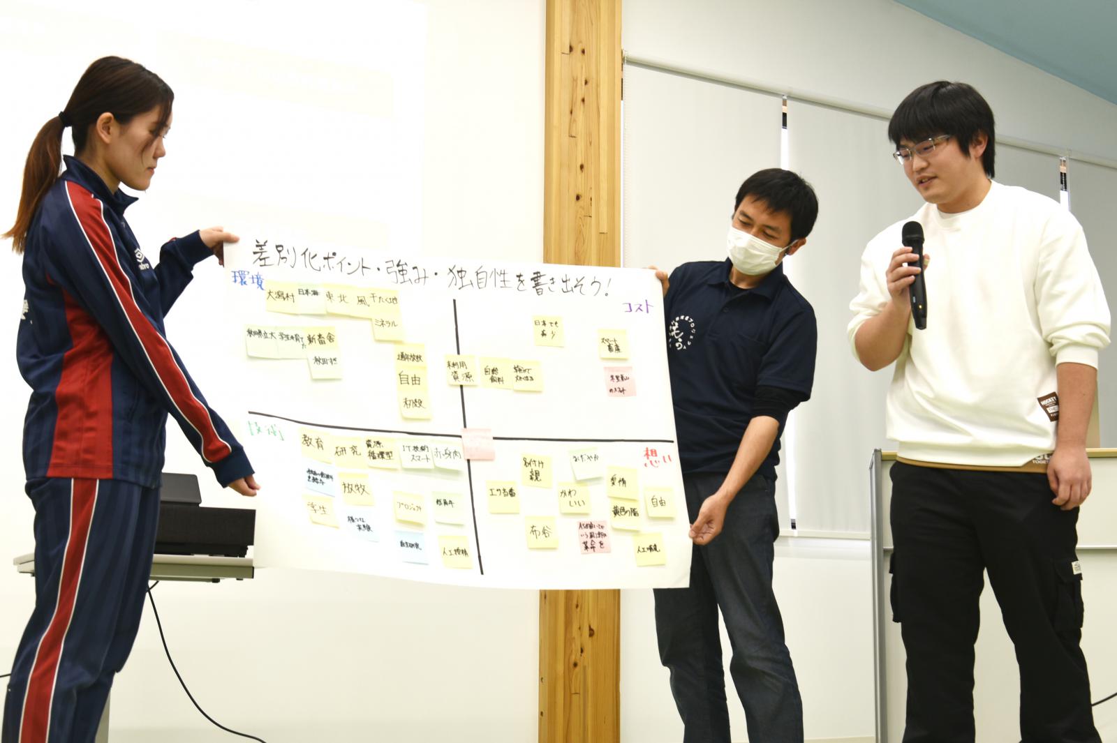 ブランディングに向けたワークショップを積み重ね、ブランド名やロゴ作成に向けてプロジェクト教職員・学生みんなでディスカッションをしました。自分たちが育てる短⾓⽜のセールスポイントや特徴、飼育している環境のメリットなど付箋に洗い出し模造紙にまとめネーミング案を話し合いました。