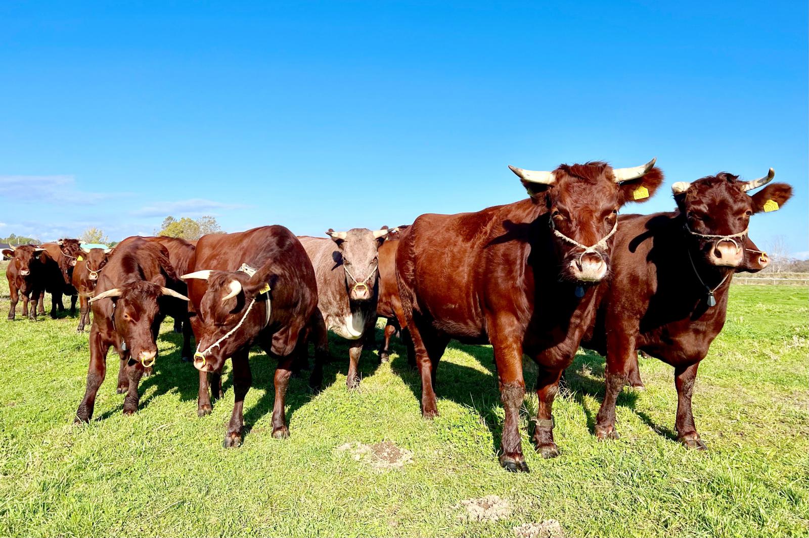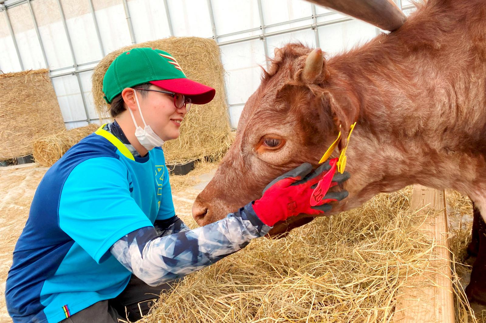 短角牛は、低脂肪・高タンパクのヘルシーな赤身肉が特徴で、一般的な黒毛和種に比べ、穀物よりも牧草などの粗飼料を多く食べ放牧適性に優れています。この特徴を踏まえプロジェクトでは、大学の附属農場としては日本一広大な本学アグリイノベーション教育研究センター圃場(190ha)で生産・栽培された牧草・飼料を食べさせ、そのふんを堆肥化し再び栽培に活用するなど、自然環境への負荷を軽減する資源循環型、国産飼料100%、持続可能な畜産を実践しています。