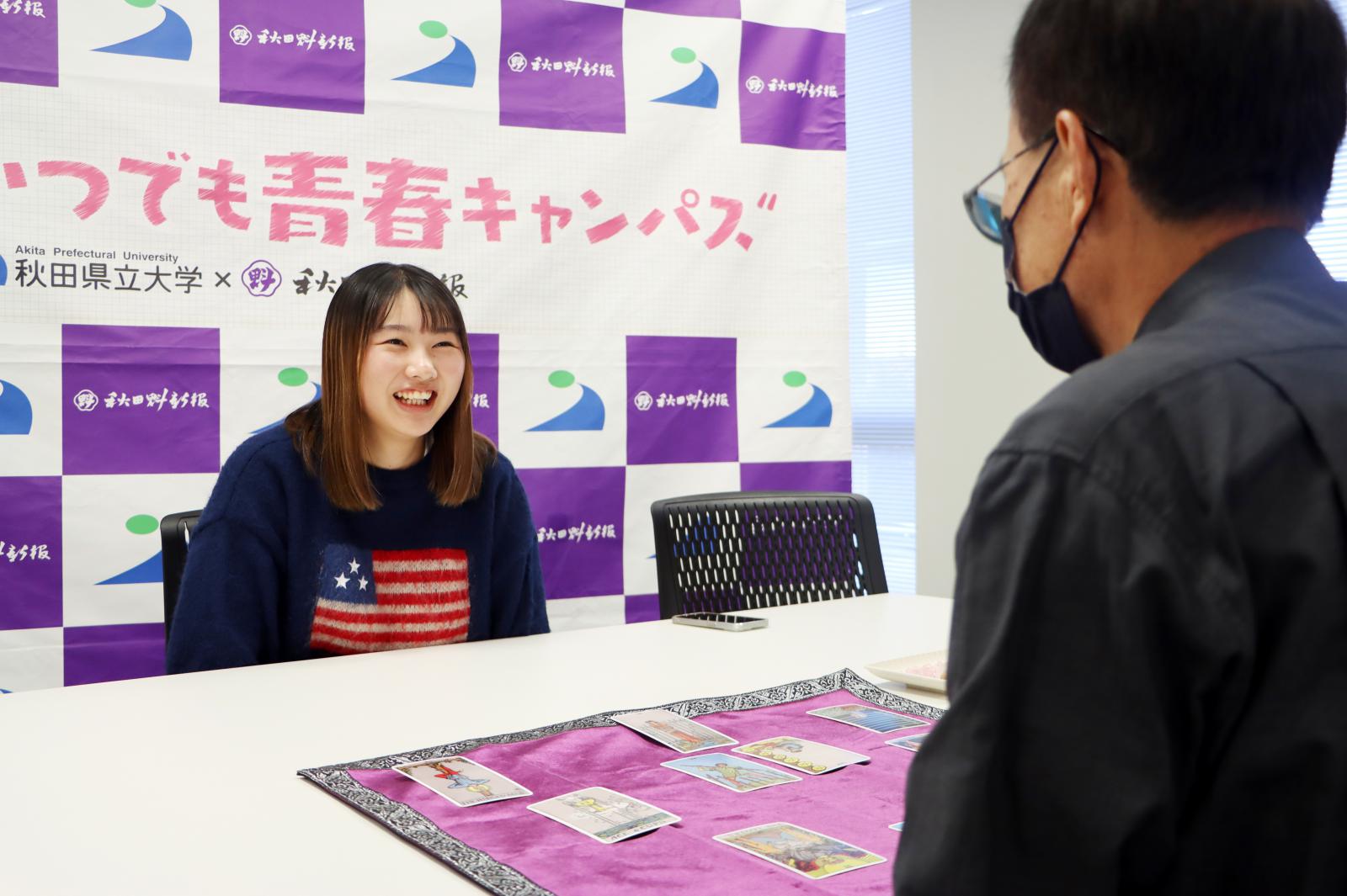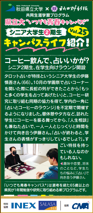 シニア大学生の伊藤 慎吾さん(66歳)は、農業短期大学時代に始めた「タロット占い」を特技としており、10月に開催された秋田キャンパス学園祭「松風松」でタロット占いコーナーを開設したところ長蛇の列ができるほど大好評でした。