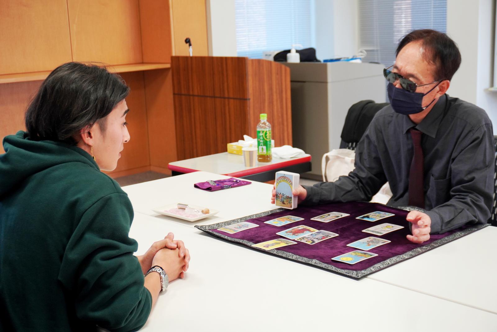 伊藤さんは、授業や研究活動の合間に訪れた学生にコーヒーを振る舞ってから、「人生相談」も兼ねて一人一人とじっくりと時間をかけて占いました。「就職や進路、将来のことで迷っています」「人間関係で悩んでいます」「どうやったら彼女はできますか?」など、学生の様々な悩みに傾聴し、カードの絵を糸口にアドバイスを行いました。