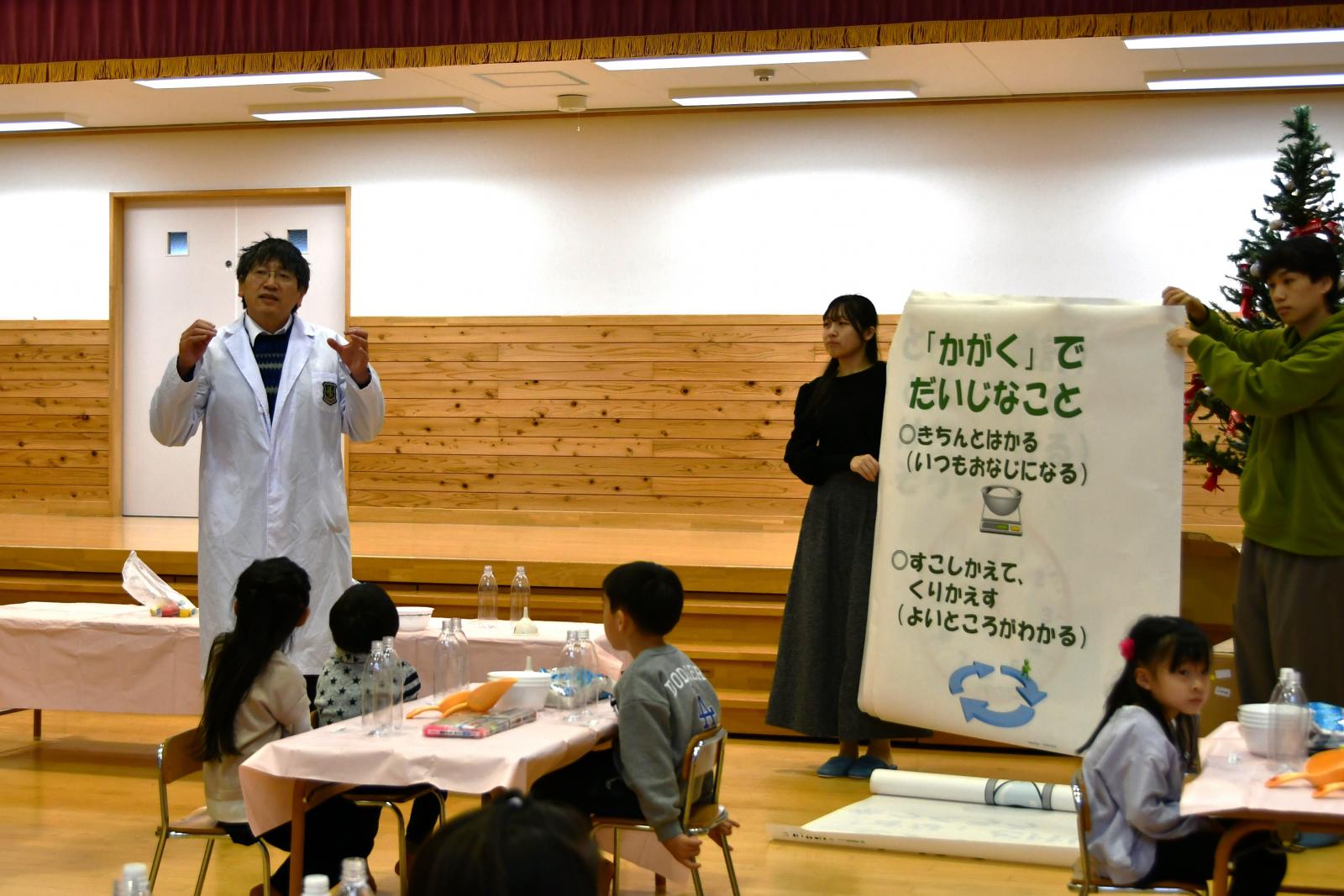 12月11日(水)に、内越保育園にて科学教室が行われました。このイベントは、内越保育園年長組の皆さんに科学の楽しさを体験してもらうことを目的に、草苅 良至 准教授(情報工学科)が例年実施しているものです。