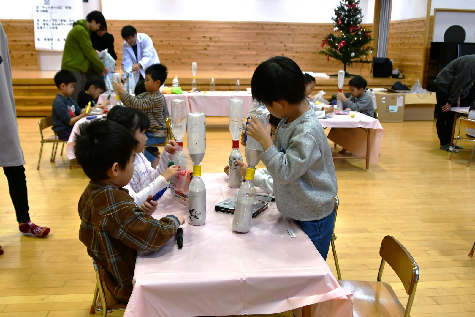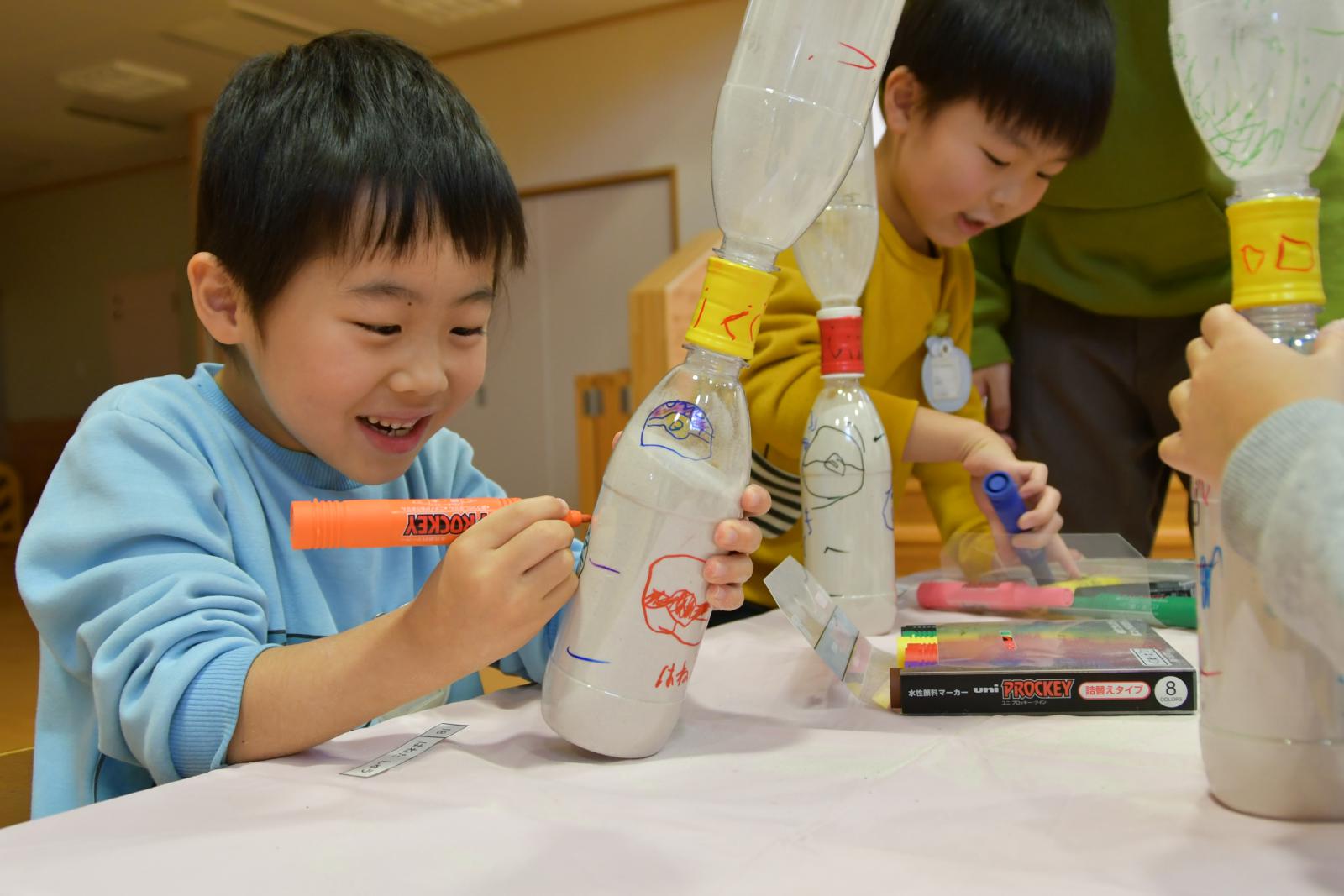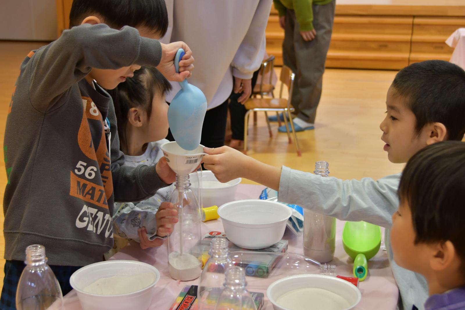 次に、砂時計の製作をしました。身近にあるペットボトルを2本と、砂遊びで慣れ親しんでいる砂を材料として使用しました。まず、決められた砂の量を計量し、こぼさないよう漏斗を使い、砂をペットボトルへ入れました。続いて、先生のカウントの声にしたがって、1分ごとに5分までの位置に目盛りの印を書きました。最後に、マジックで絵を描いてオリジナル砂時計を完成させました。