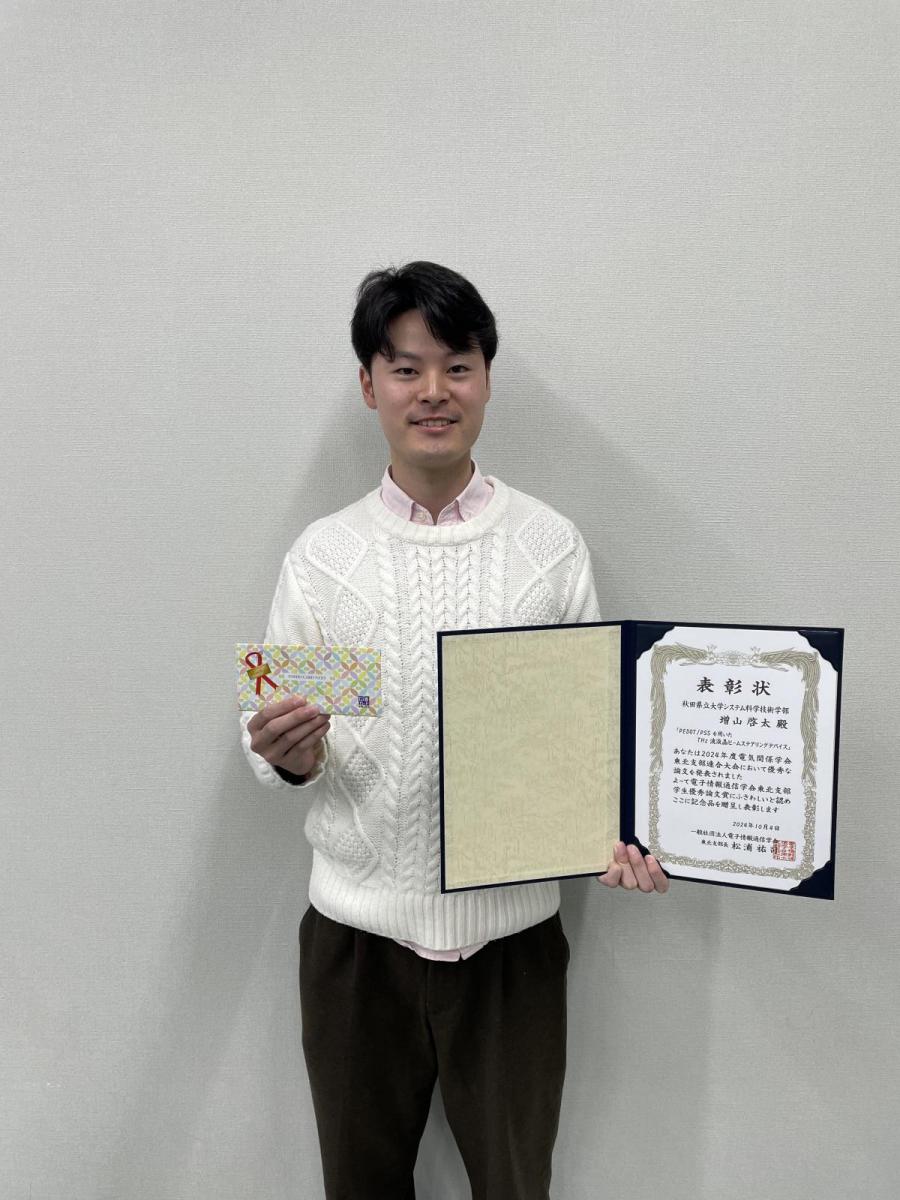 システム科学技術学部システム科学技術研究科知能メカトロニクスコース2年増山啓太さんが、2024年度電子情報通信学会東北支部優秀論文賞を受賞しました。本賞は2024年8月29-30日に本学本荘キャンパスで開催された電気関係学会東北支部連合大会において、優秀な研究論文を発表した学生に送られます。受賞対象となった研究タイトルは以下の通りです。PEDOT/PSSを用いたTHz波液晶ビームステアリングデバイス
