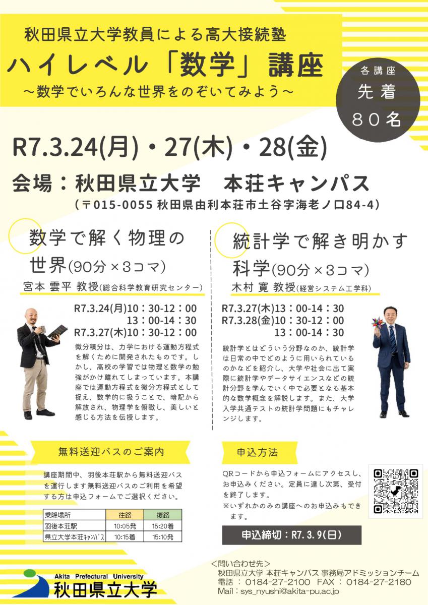 令和7年3月24日(月)、27日(木)、28日(金)の3日間、本荘キャンパスでハイレベル数学講座を開催します。この講座は、理数科目に関心の高い県内高校生に対し、社会への活用を見据えた数学や統計学の学習を行い、また、数学と物理がどのように結びつくかを学ぶことで、高校数学の深い理解を目指します。各講座を修了した方には修了証を交付します。