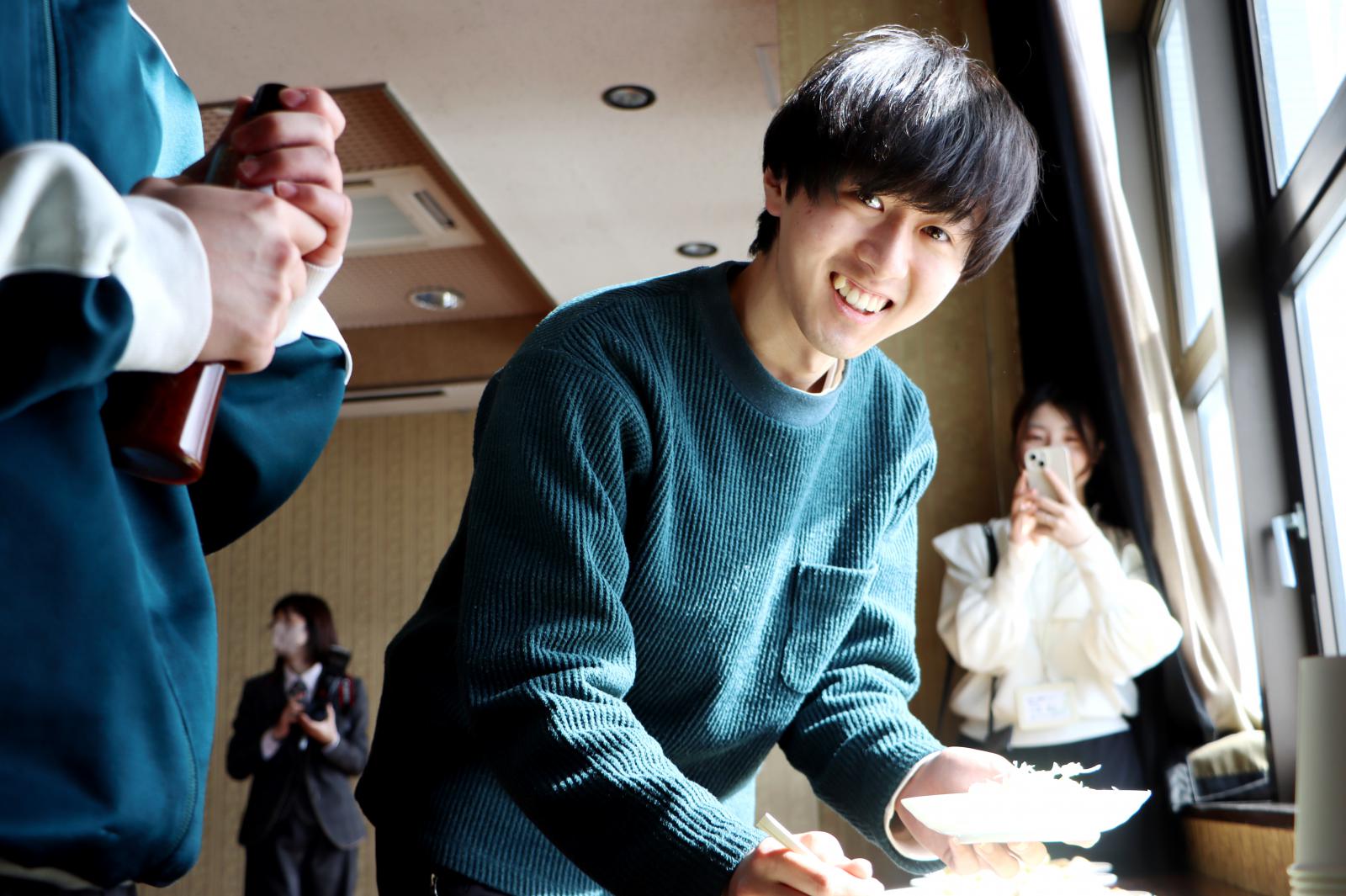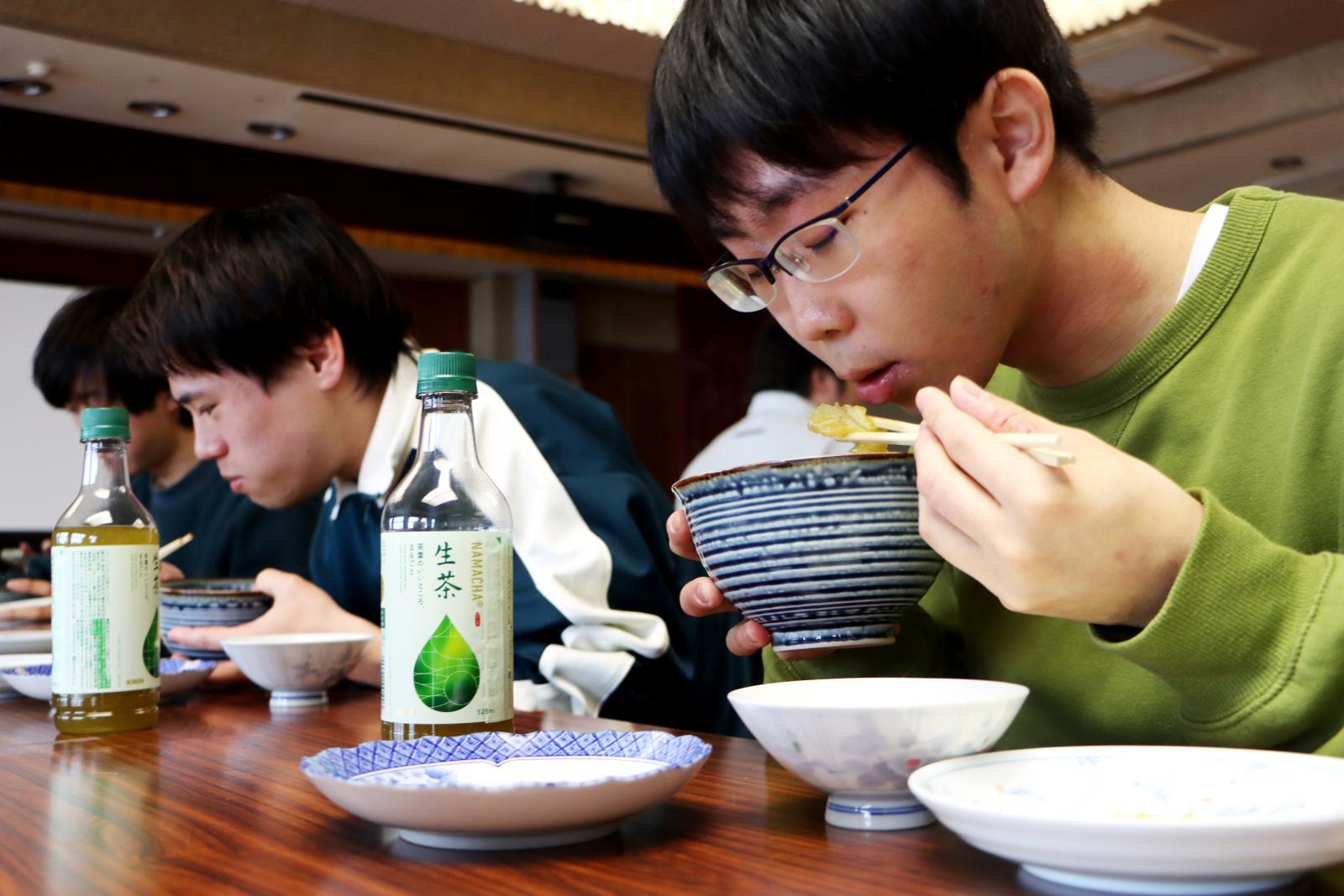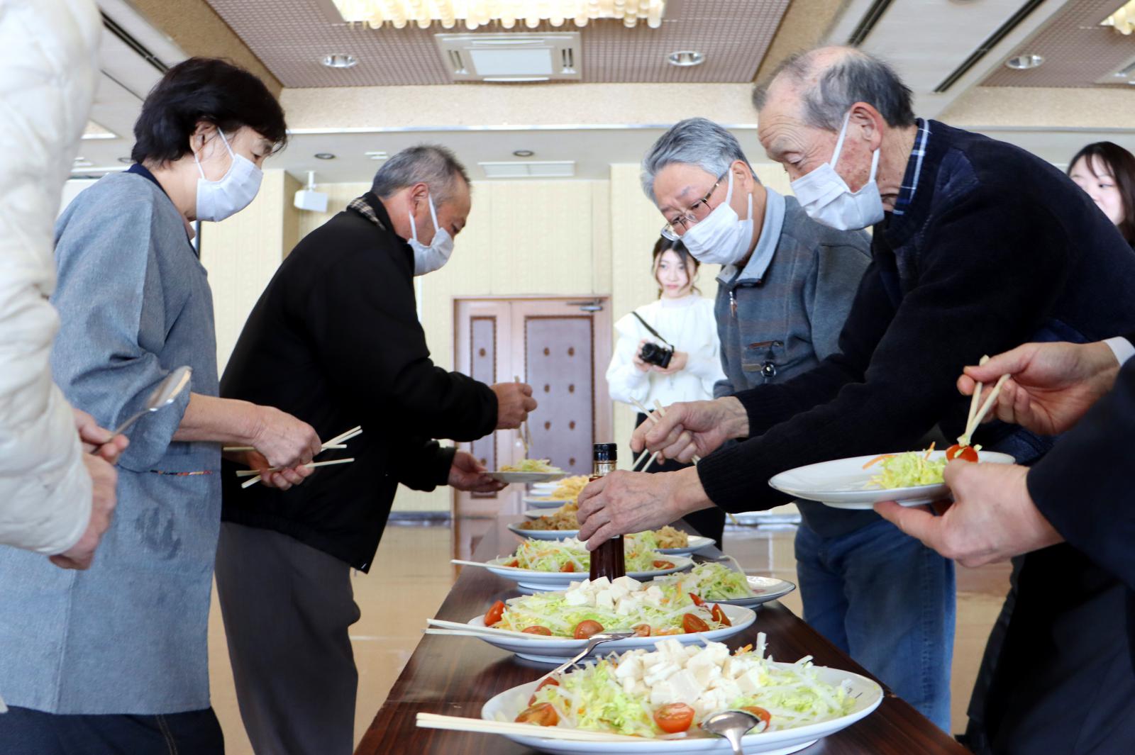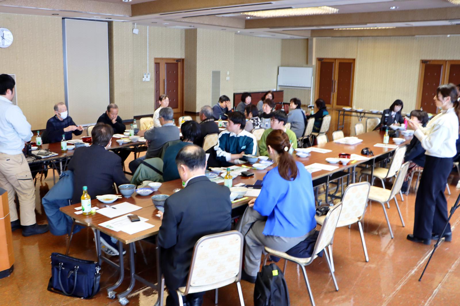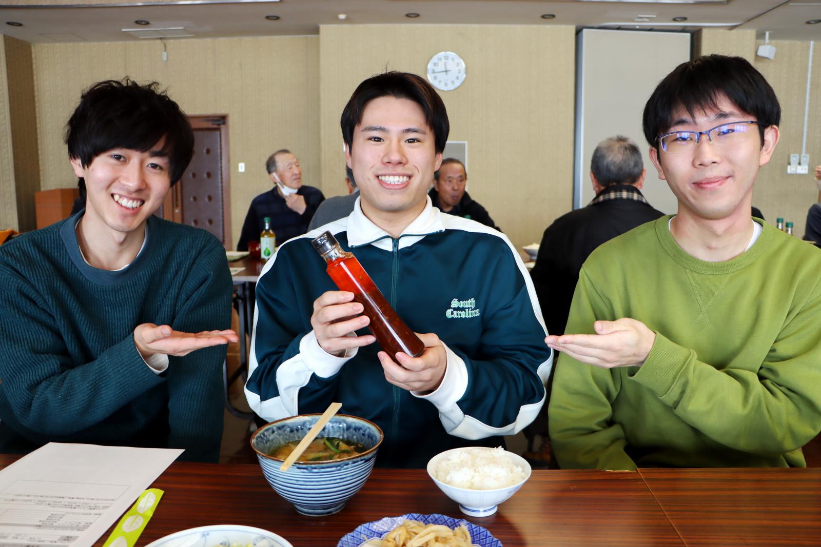 三種町琴丘地区の特産であるソラマメを加工して豆板醤を製造しているJA秋田やまもとそらまめ部会では、『豆板醤ドレッシング』の開発に取り組んでおり、生物資源科学部 応用生物科学科/食品醸造グループ(指導教員:伊藤 俊彦 准教授[専門:醸造学])が商品開発に協力しています。令和7年2月20日(木)には、開発メンバーや関係者が一堂に会し試食会が開催されました。同部会メンバーが持ち寄った新鮮な野菜サラダに、今回試作したドレッシングをかけて味わったほか、じっくり煮込んだ自家製みそ仕立てのキムチ鍋にもドレッシングをかけて試食しました。