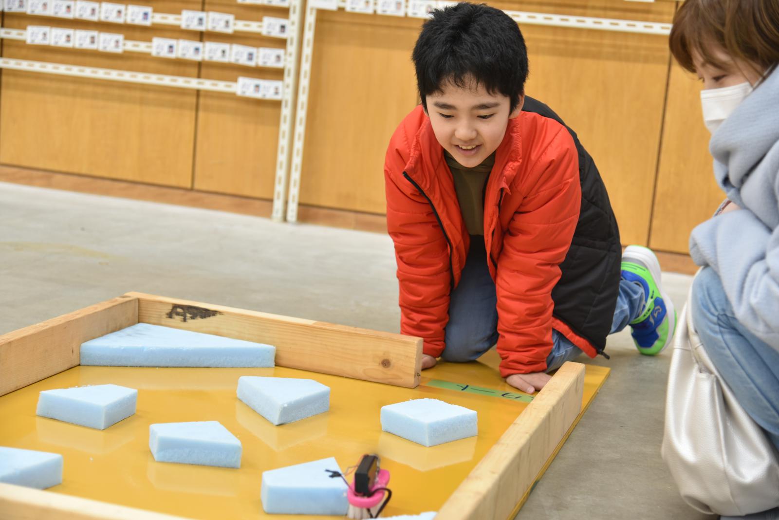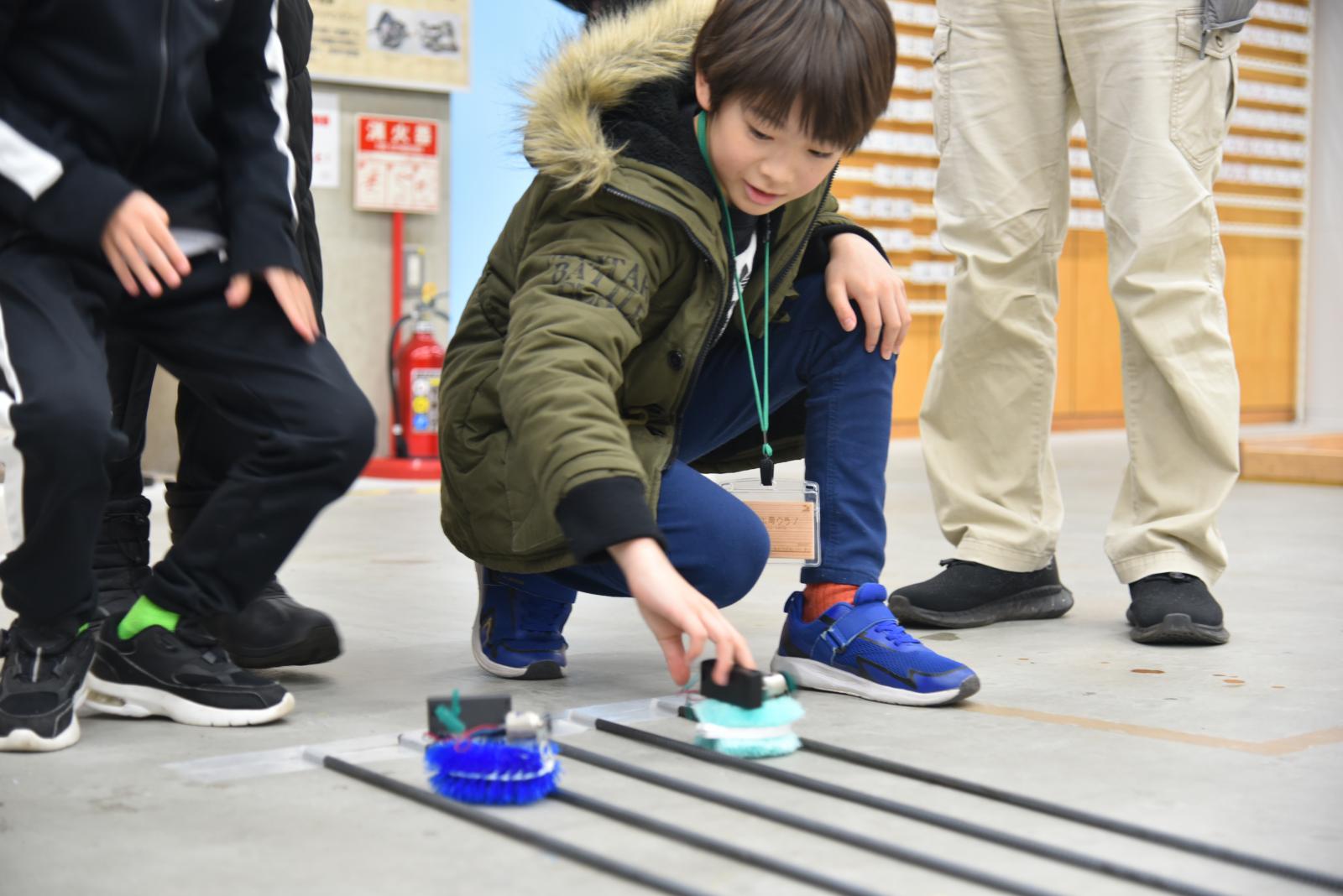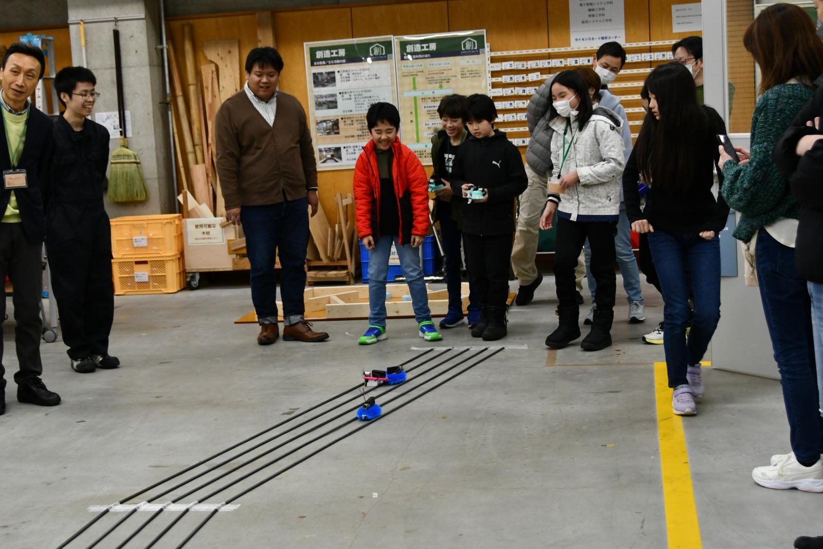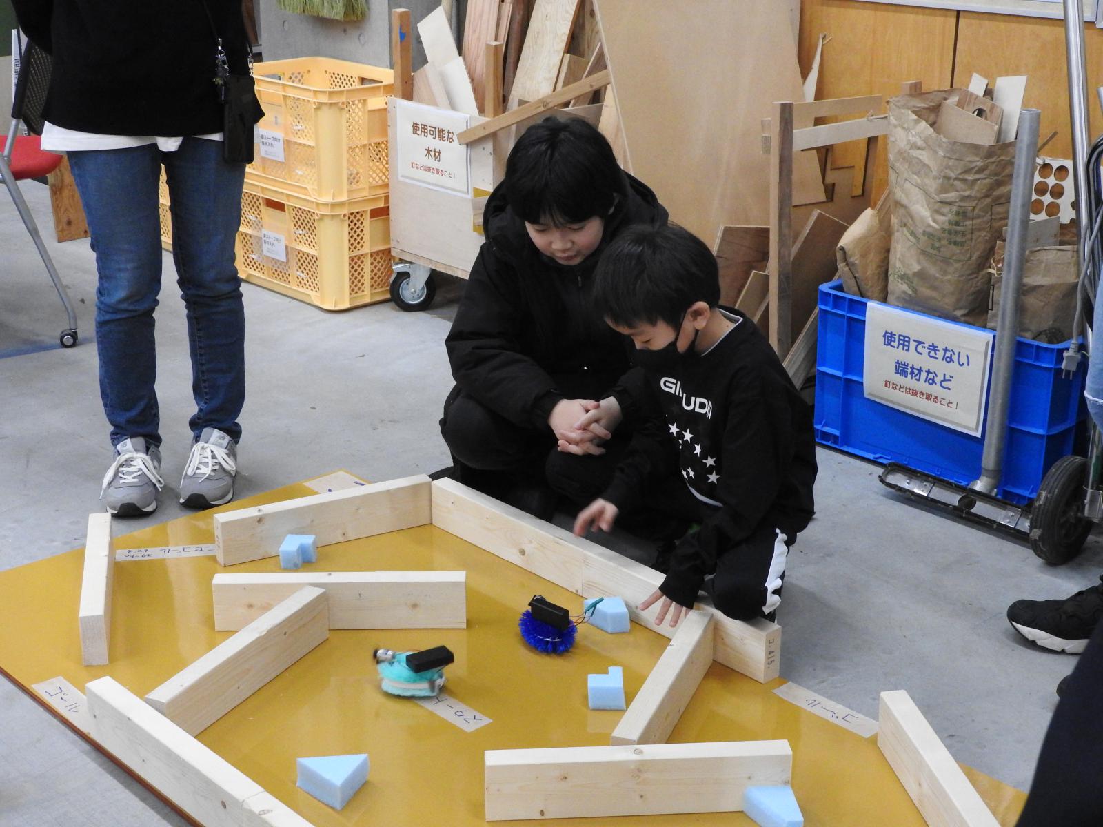 マシン完成後は、創造工房特製のレースコースを走らせて競争したり、障害物のある迷路を、障害物を避けながらゴールまで進み、そのタイムを競って楽しみました。