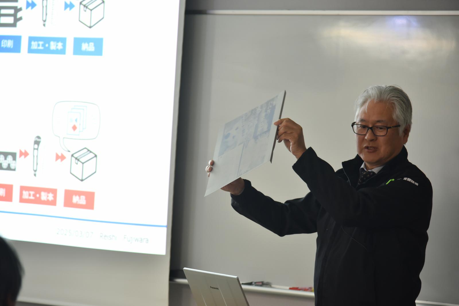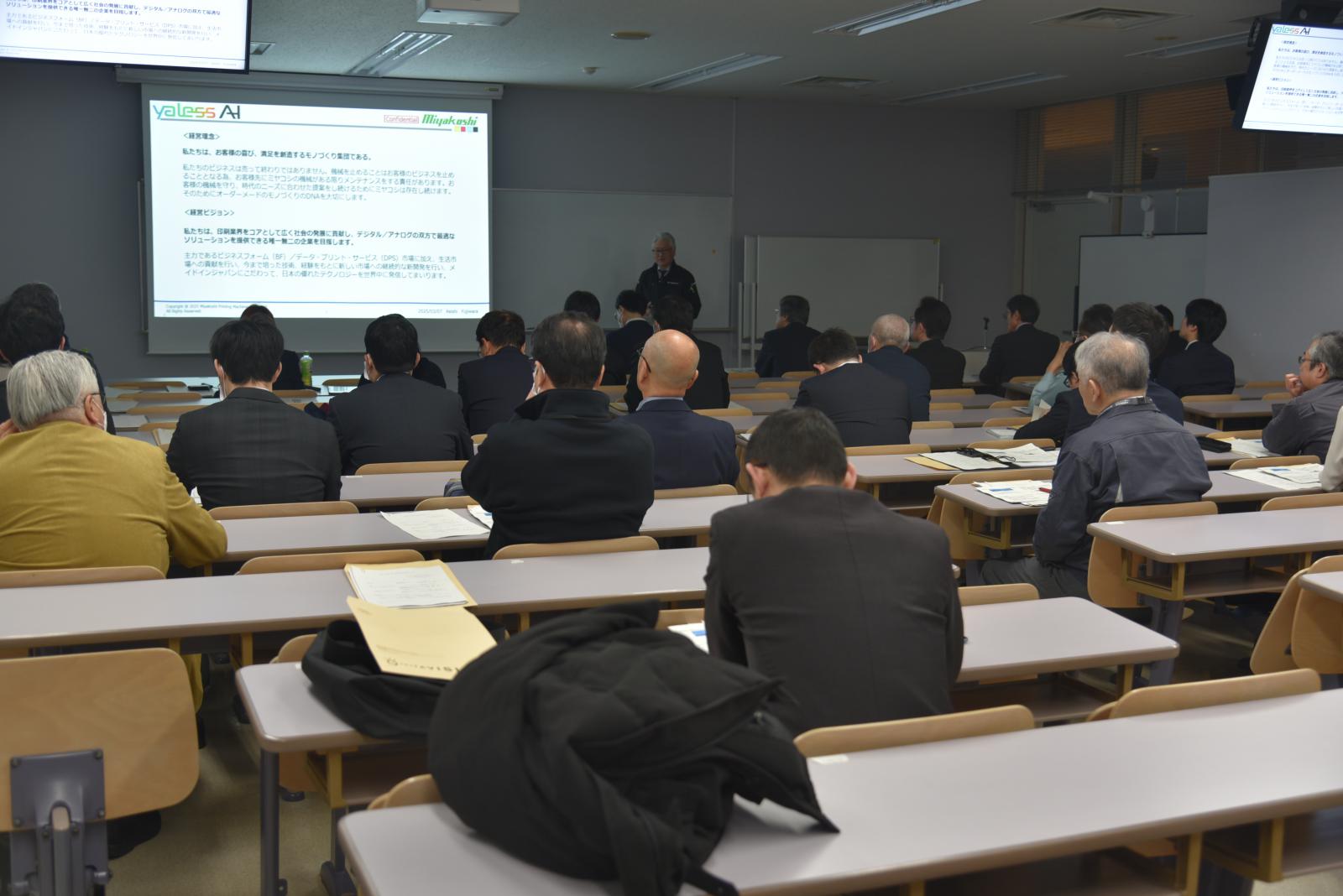 まずはじめに、宮腰精機株式会社の藤原鈴司様と、秋田県産業技術センターの阿部禎也様による、「オフセット印刷におけるAIアシストシステム(yaless AI)の開発経緯とその成果」と題した発表が行われました。yaless AIはオフセット印刷設定操作を支援するAIアシストシステムであり、損紙(ヤレ紙)の低減やユニット内のセンサーで異常を検知し、メンテナンスなどができるシステムです。発表では、yaless AIの技術的な特徴だけではなく、現場の職人の技を徹底的に観察したことや外部支援者の有効活用などAI活用の成功の秘訣にも触れられていました。