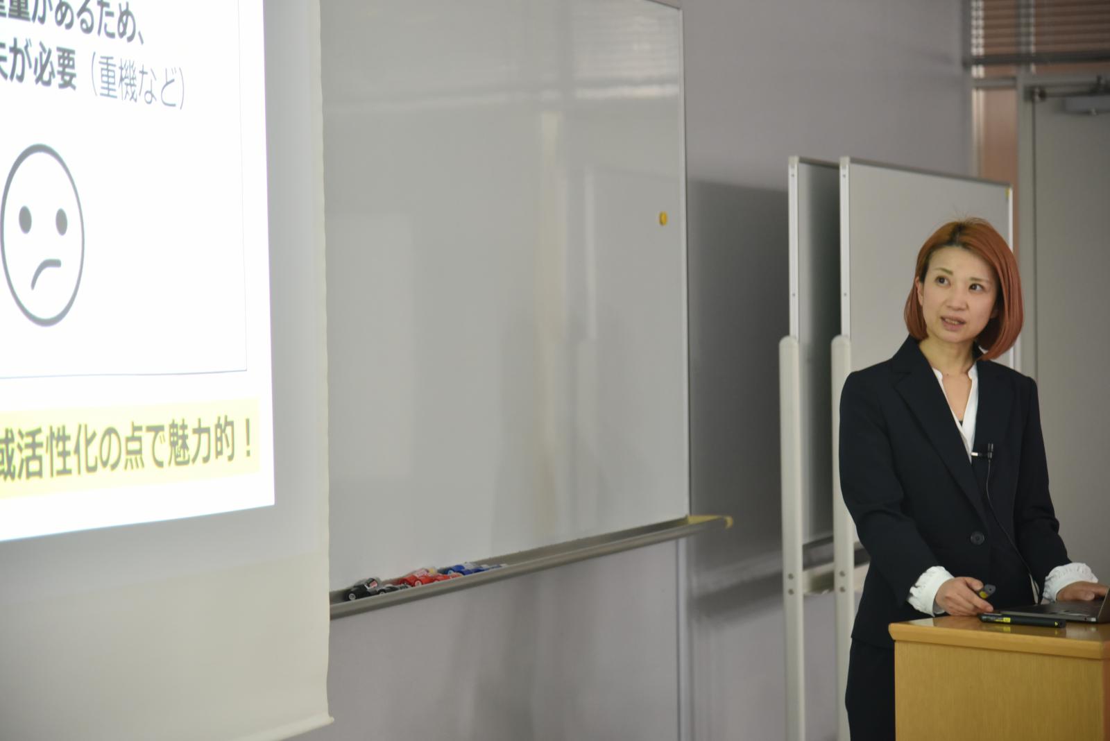 次に、「耐積雪100 cm の木製カーポート~産官学連携による研究開発と商品化の歩み~」と題して、建築環境システム学科 板垣 直行 教授と株式会社マサカ の眞坂恵理子 様による発表が行われました。発表ではお客様から上がった「木でカーポートを作れないか?」という声から本学地域連携・研究推進センターを経由して板垣先生との共同研究が始まった経緯が紹介されました。また、打ち合わせ中に「大学院ではどのようなことを学ぶのでしょうか?」という眞坂様の質問から本学大学院への進学を志し、社会人特別選抜試験に合格、長期履修制度を活用して研究を進められていることなどが話題にあがりました。