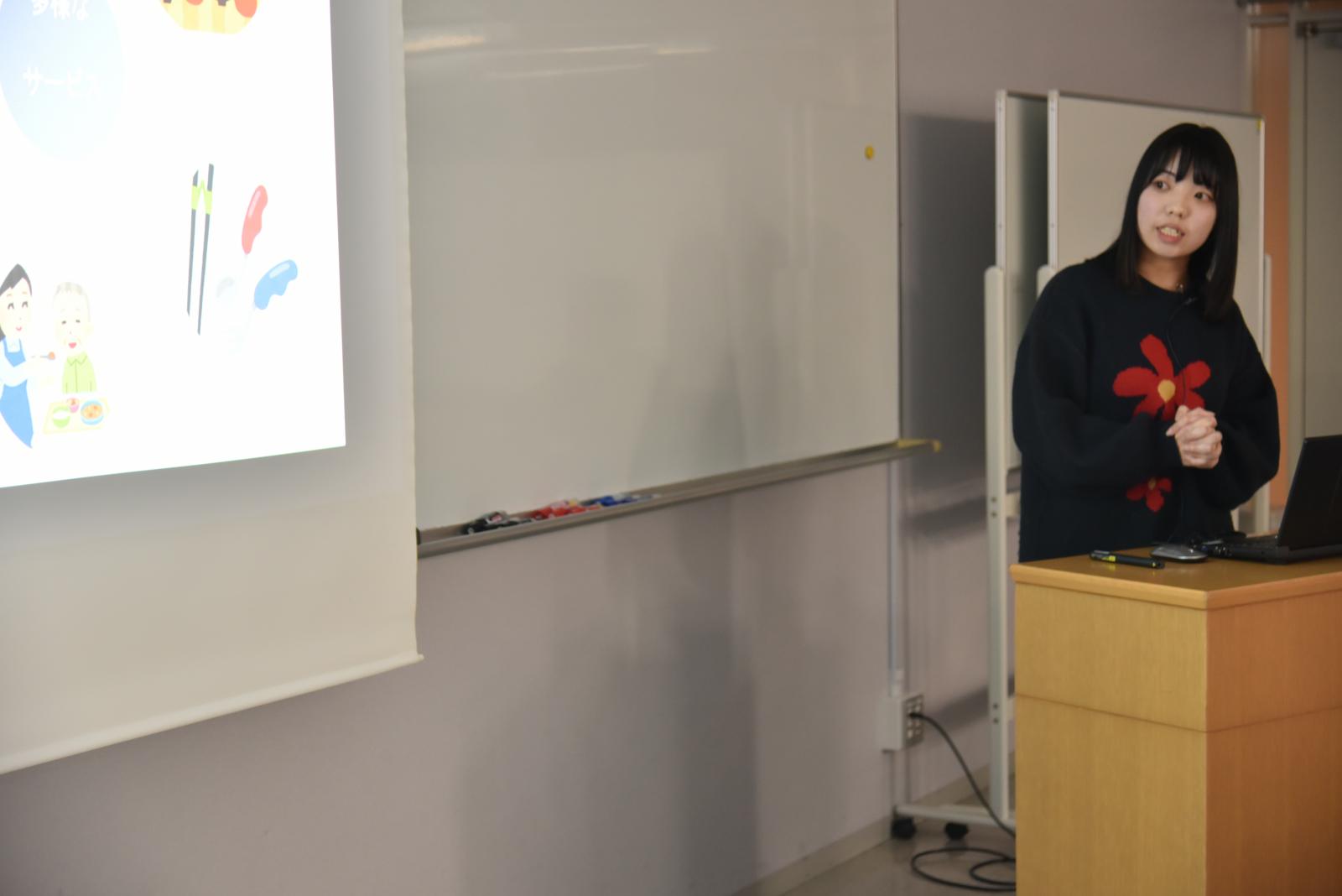 また、情報提供として、キャップストーンプロジェクトの成果発表も行われ、経営システム工学科3年の植田紗羽さんが株式会社虹の街様の課題にグループで取り組み、「あきらめない介護の周知~レンジでケアご飯選手権の開催~」と題し、在宅介護サービスの認知度を向上させるために「レンジでケアご飯選手権」を実施したことと、その結果を分析したところ、選手権には広報効果があり、選手権(コンテスト)を通じて在宅介護サービスの認知度が向上したことを報告しました。