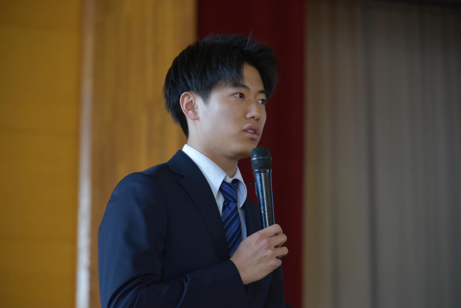 講話の中で板橋さんは自身が所属しているアグリビジネス学科を起点に大学の概要を説明したあと、自身が履修している教職課程やサークル活動といったキャンパスライフについて説明をしました。講話後には、後輩から「なぜ県立大学へ進学したのか」や「教員を目指すきっかけは?」といった質問が次々にあがり、板橋さんの講話に対する関心の高さが伺えました。