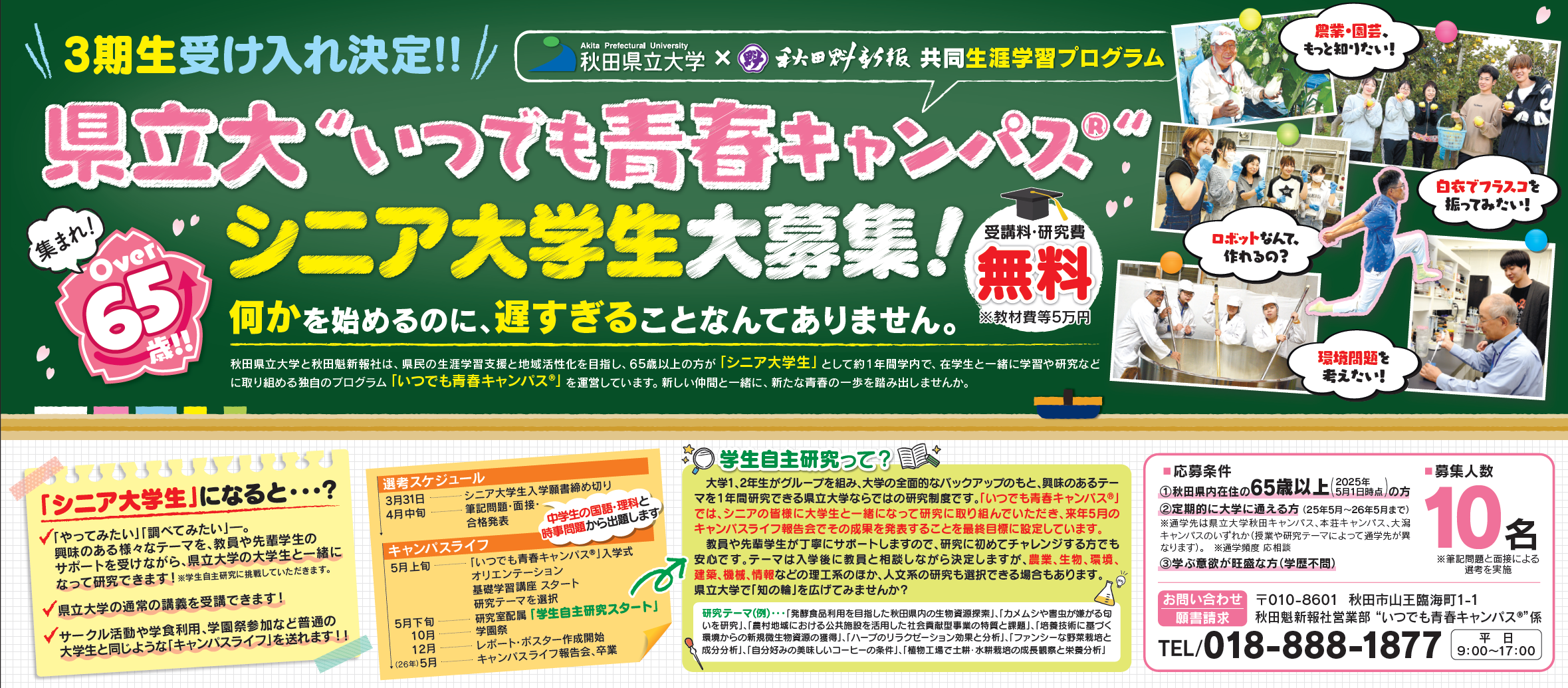 人生100年時代、高齢化率が全国で最も高い本県において、健康でイキイキと暮らしていくためには、生涯を通して必要な時に必要な学びを通じて生活の質を維持・向上させることが不可欠です。秋田県立大学と秋田魁新報では、県民の生涯学習支援と健康寿命の延伸、さらには地域の活性化を目指し、65歳以上の方を「シニア大学生」として受け入れ、在学生と一緒に学習や研究、課外活動に取り組めるプログラム『いつでも青春キャンパス』を連携・展開しています。この度、シニア大学生・三期生を募集します。何かを始めるのに、遅すぎるなんてことはありません。あなたもシニア大学生として、新たな青春の一歩を踏み出しませんか!!応募条件
