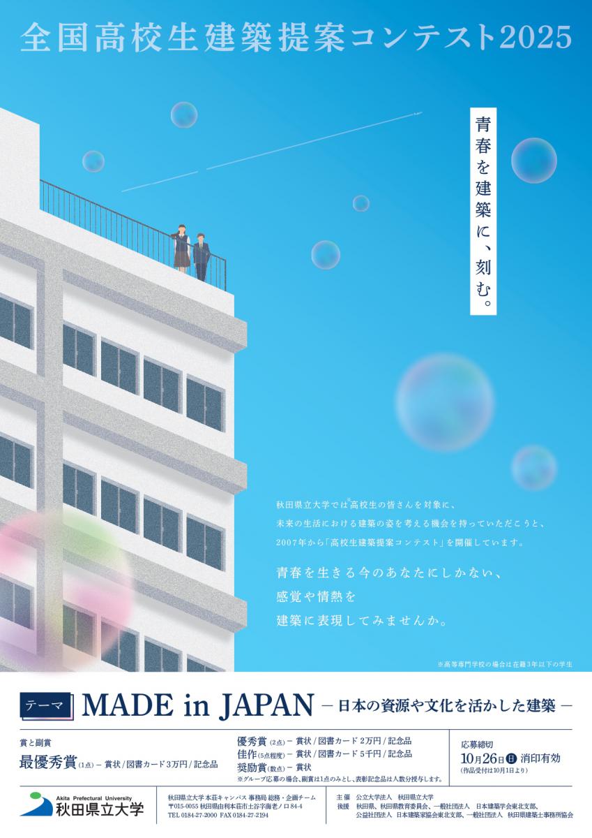秋田県立大学では高校生*の皆さんを対象に、未来の生活における建築の姿を考える機会を持っていただこうと、2007年から「高校生建築提案コンテスト」を開催しております。