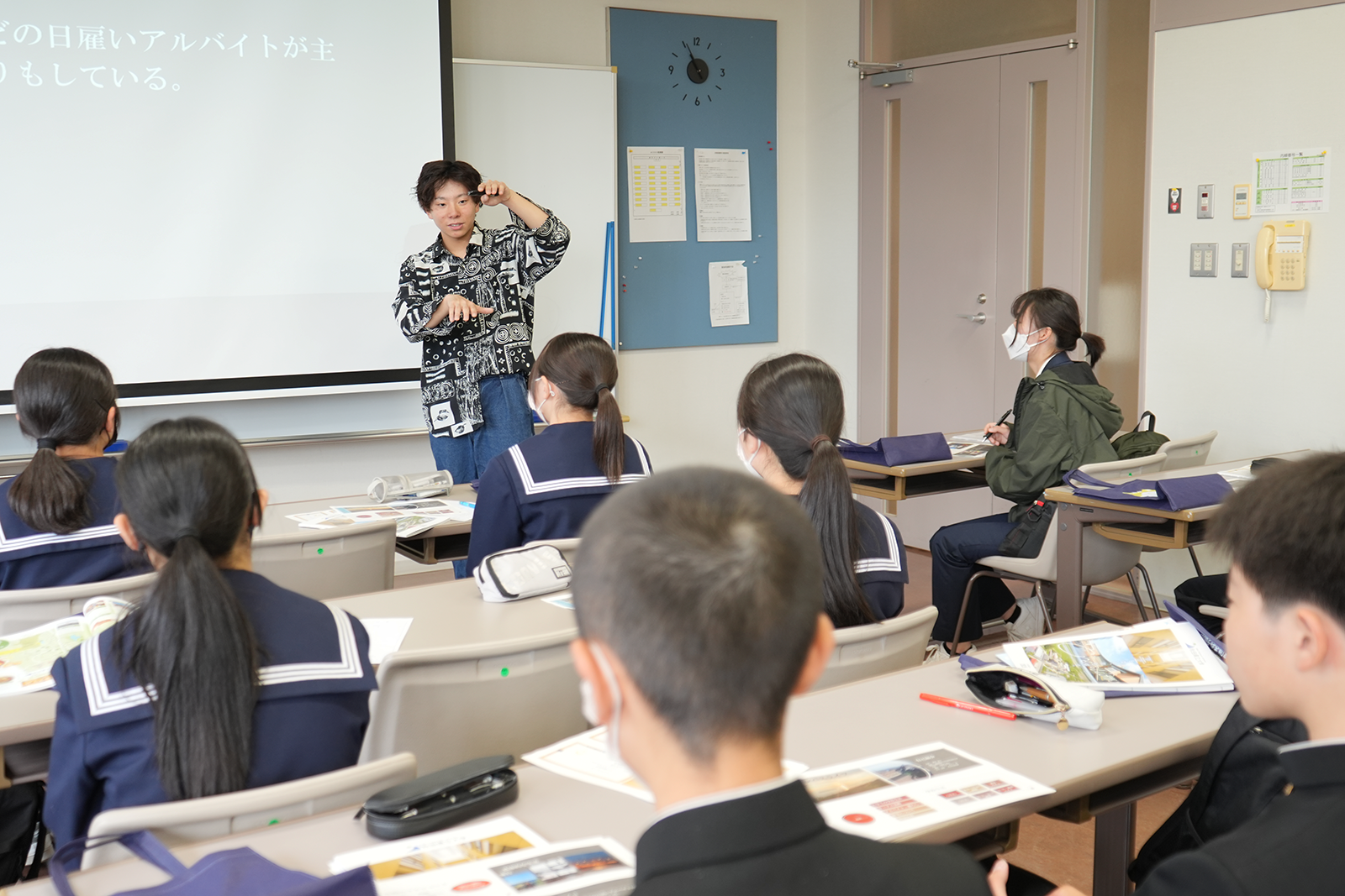 応用生物科学科2年の横田 悠正さん(京都府出身)によるキャンパスライフ紹介が行われました。学生自主研究の紹介、県大生が数多く参加している「農業バイト」、さらには自身が所属している文芸・イラストサークルの活動の中で、交通安全の看板のイラスト制作に携わったエピソードなど、大学生活について発表しました。横田さんからは、「地元を離れて進学し大変なこともたくさんあるが、大学生活はすごく充実している。中学高校と進むにつれて、テストや部活動などやるべきことがたくさんあると思うが、ぜひ頑張ってください!」とメッセージが送られました。