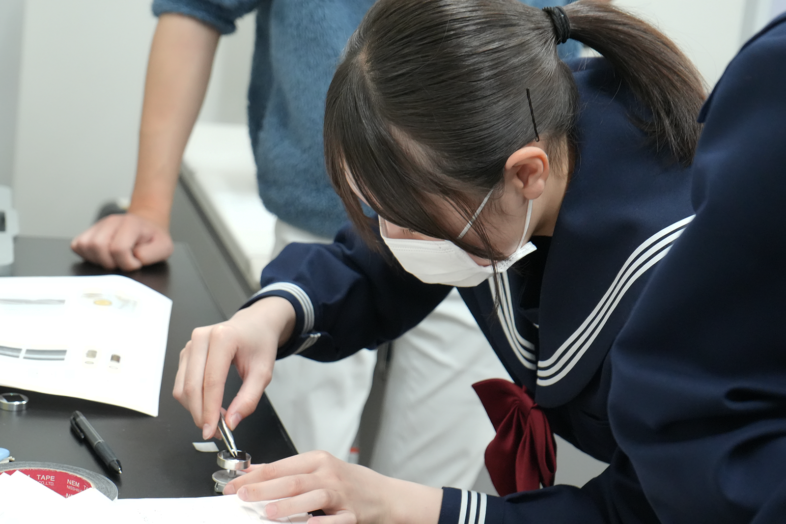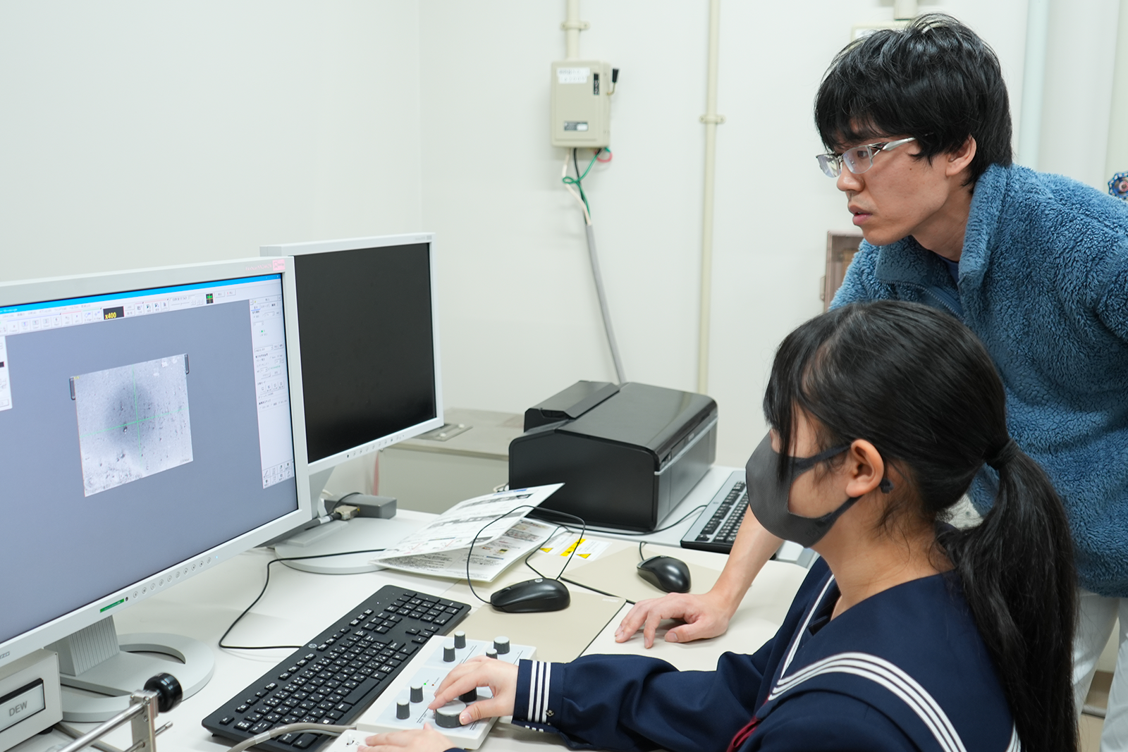 生物環境科学科の渡邉 俊介 助教による「身近なものを電子顕微鏡で観察しよう」というテーマの模擬講義を受講しました。顕微鏡の歴史や原理といった基礎を学んだあと、バイオテクノロジーセンター内にある「走査型電子顕微鏡」を使って実験を行いました。自分の「髪の毛」のキューティクルを観察した中学生からは、「髪の毛のキューティクルを見るのが楽しかった。」「台に載せるときに使用したピンセットの傷まで見えて驚いた。」といった感想が上がりました。水生生物の「珪藻」の観察では、珪藻によって条線(穴をつなげた線)や縦溝(真ん中の線)が異なることに驚き、多数の珪藻を観察し自分好みの模様を探している様子が見られました。