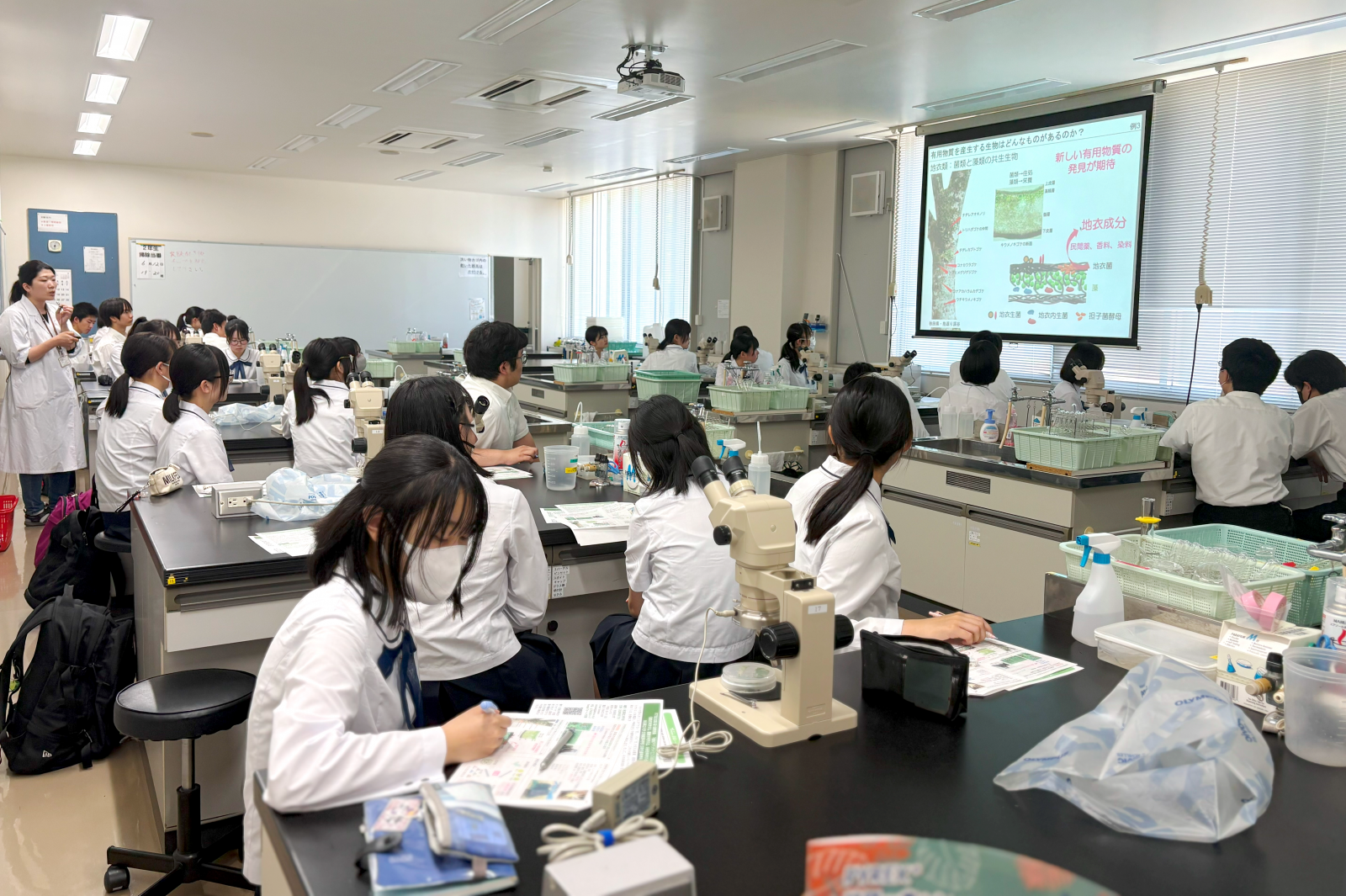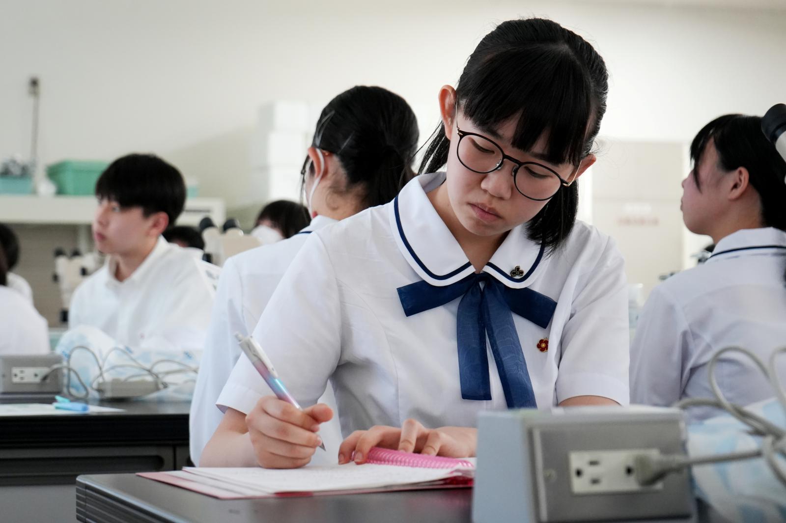 生物生産科学科の川上 寛子助教(植物資源創成システム研究室 [専門:植物工学])による模擬講義『生物が作り出す有用物質』を受講しました。川上助教からは、薬品や化粧品の原料となる薬用植物やハーブ、菌類と藻類との共生生物である地衣類などを有用物質を、安定的に大量生産するための研究について説明がありました。講義の中で、実際に学部2年生が化学・生物学実験Ⅱで培養しているトルコギキョウの組織培養の状況を顕微鏡でじっくり観察しました。川上助教からは、「今まで気にも留めてなかった植物が実は有用な性質を持っているかもしれない。それが植物の生存戦略として自ら作り出してきたことの不思議さや面白さ、ロマンを感じてほしい!」とメッセージが送られました。模擬講義は、高校の授業とは異なり専門的な内容にも触れて生物資源に関する興味・関心を高める機会となりました。模擬講義『生物が作り出す有用物質』