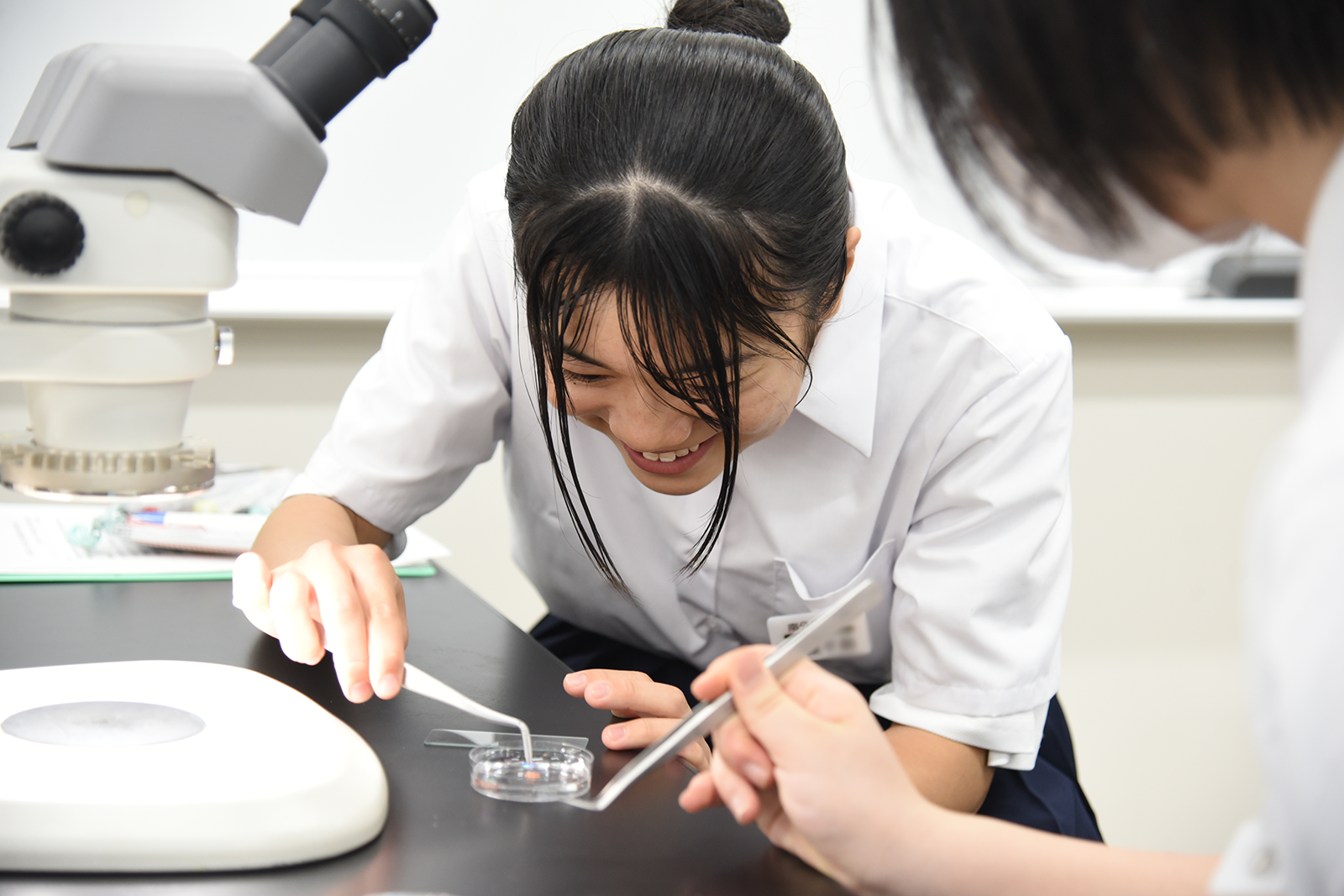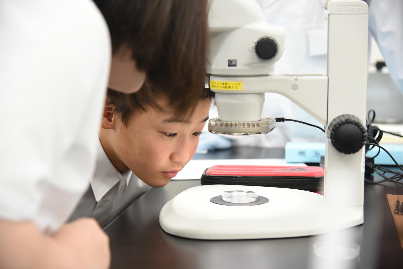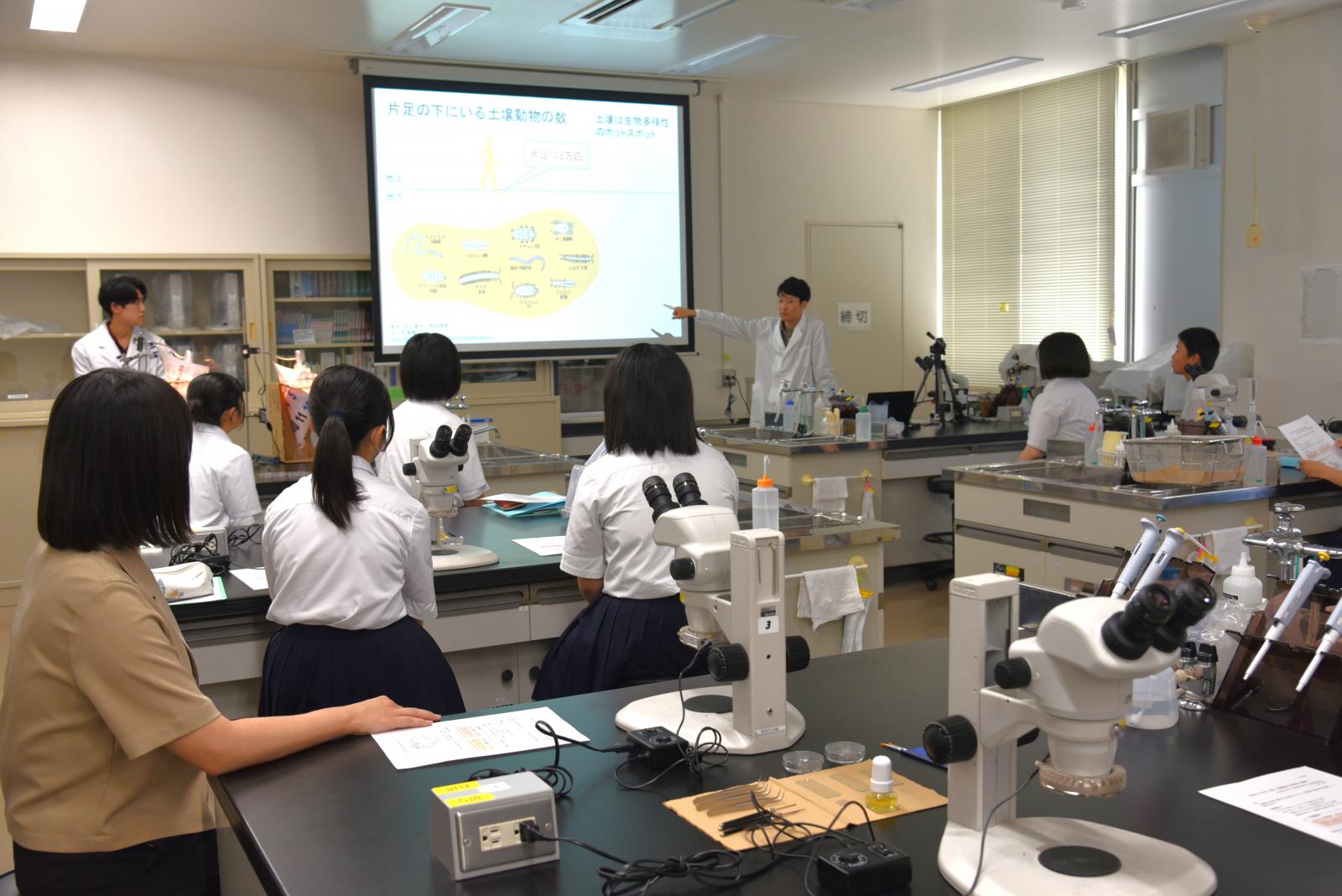 生物環境科学科の田中 草太 助教[専門分野:土壌動物学]による『身近な土の中に潜む土壌動物の多様性と機能』と題したテーマの模擬講義を受講しました。田中助教と本学学生のサポートの下、ツルグレン装置(土壌中の小さな生き物を効率的に採集するための装置)を用いて、土の中から抽出した土壌動物を採集し、プレパラートを作成したあと、各々が作成したプレパラートを顕微鏡で観察しました。プレパラート作りでは、抽出した土壌動物をピンセットで慎重に乗せ、カバーガラスをかぶせる際には気泡が入らないようゆっくり乗せたりと、細かな作業を丁寧に作業する様子がみられました。顕微鏡での観察では、「土の中にこんなに生き物がいることに驚いた」「動いている姿がかわいい」といった感想が上がりました。最後はお土産としてプレパラートをお持ち帰りいただき、体験に満足した様子でした。