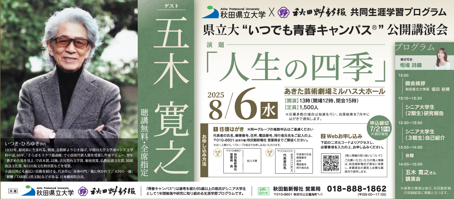 このたびはご好評につき満員御礼となりお申込受付を終了いたしました。定員を超える応募をいただき誠にありがとうございました。聴講可能な方には、招待券を順次、郵送によりお送りします。 本学と秋田魁新報では、県民の生涯学習支援と健康寿命の延伸を目指し、65歳以上の方を「シニア大学生」として本学で受け入れ、在学生と一緒に学習や研究、課外活動に取り組むプログラム「いつでも青春キャンパス」を実施しています。この度、シニア大学生の成果発表と本プログラムの更なる機運醸成を図るため、作家・五木寛之さん(92歳)」をお招きし講演会を開催します。