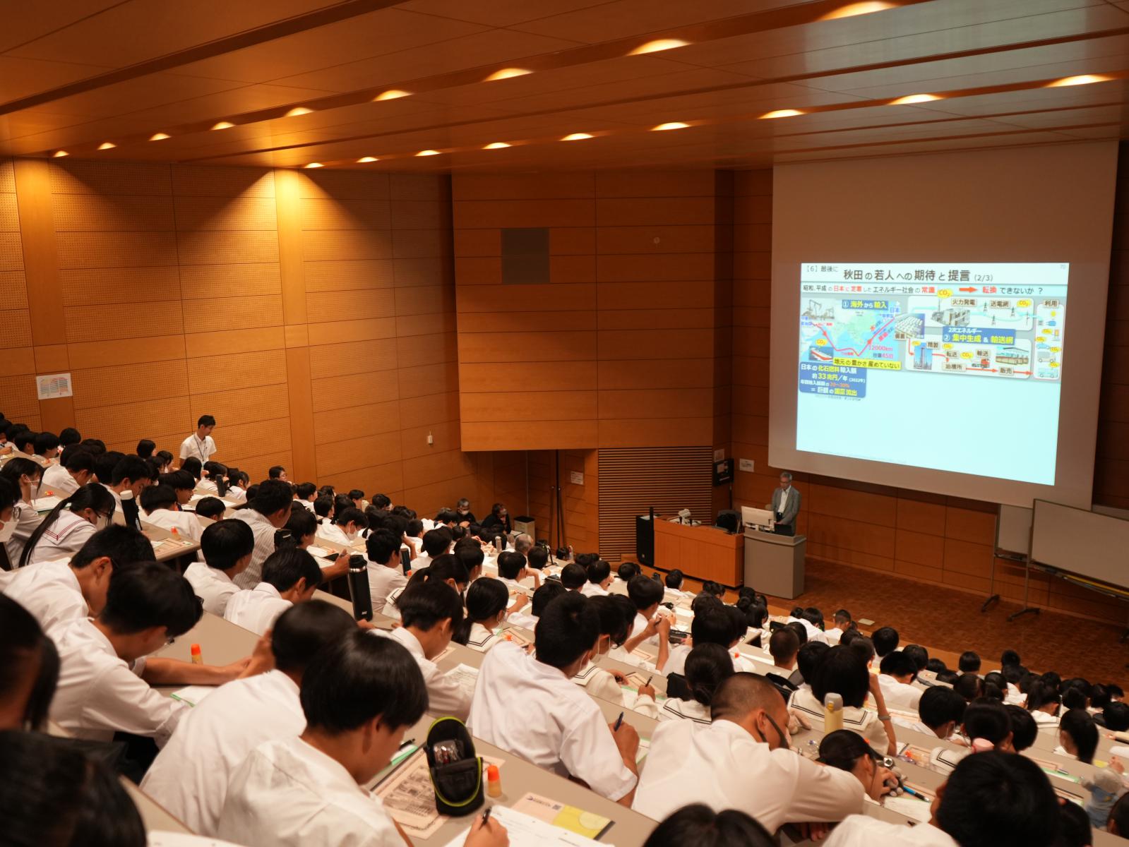 久保馨客員教授による「秋田発 脱炭素エネルギー社会の実現」をテーマとした特別授業を受講いただきました。講話では、世界におけるエネルギー排出量の現状や、脱炭素社会に向け私たちがやるべきことについて、動画を交えながらお話しいただきました。秋田県の強みである洋上風力発電の活用や課題についても取り上げられ、自分たちの暮らす秋田県の抱える問題として、メモを取りながら真剣に講話を聞いている様子が印象的でした。司会の夏井博実コーディネーターから本日の流れを説明