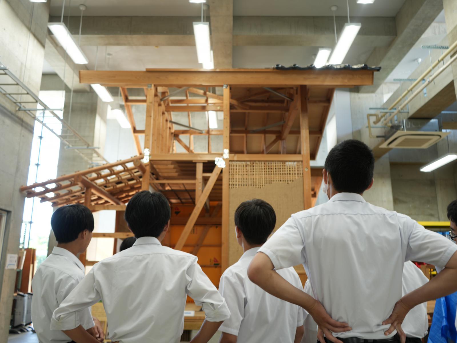 研究紹介では、システム科学技術学部5学科の学びをぎゅっとまとめた「【ROOTS THE MOVIE vol10】『サイエンス&テクノロジー』秋田県立大学システム科学技術学部/本荘キャンパス」を視聴いただきました。キャンパス探訪では本荘キャンパスの図書館、ラーニングコモンズ、学部棟、創造工房などの特徴的な施設を見学いただきました。図書館では、大学図書館ならではの蔵書の多さや24時まで利用できる開架時間の長さなど、中学校の図書館との違いに驚きの声があがっていました。2階から6階までの吹き抜け構造が特徴的な学部棟では、建築環境システム学科の学生が制作した模型や椅子を見学しました。こんなに細かく作れるなんてすごい、こんなところに住んでみたいなど友人同士で大いに盛り上がっていました。