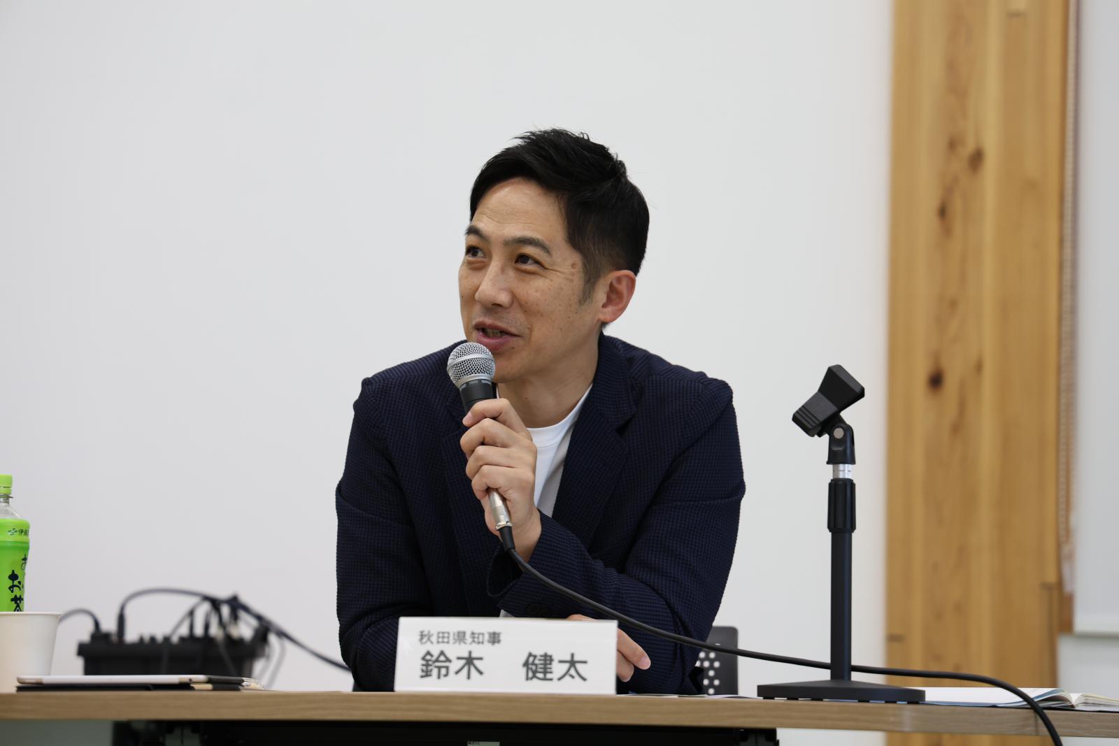 今回は「秋田県のスマート農業をリードできる人材の育成について」をテーマに、全国農業協同組合連合会秋田県本部 営農支援課課長の伊藤亘さん、そしてスマート農業指導士育成プログラムを修了した松田久樹さん(令和4年度修了)、高橋直子さん、畠山周さん(いずれも令和5年度修了)、そして同プログラムに関わる本学アグリイノベーション教育研究センター長の西村洋特任教授、同センター人材育成グループの上田賢悦教授(アグリビジネス学科)が参加し、鈴木健太秋田県知事と意見交換を行いました。