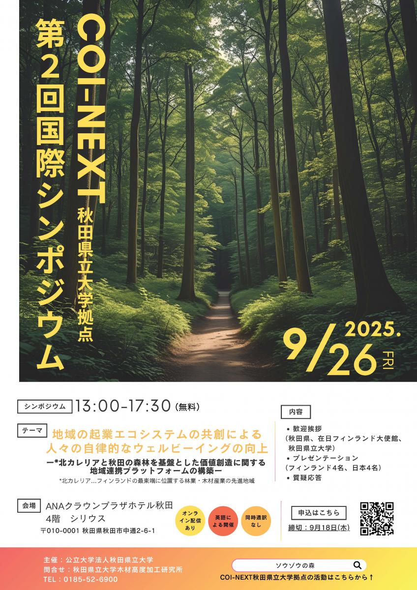 この度、COI-NEXT 秋田県立大学拠点において、第 2 回目となる国際シンポジウムを開催する運びとなりました。本シンポジウムでは、フィンランド北カレリアと秋田を中心に、森林を活かした地域の価値創造や起業エコシステムの共創について議論します。国内外の研究者や起業家が、エネルギー、建築、観光など多彩な分野での取り組みを発表し、持続可能な社会の実現や人々の自律的なウェルビーイング向上に向けた新たな可能性を探ります。
